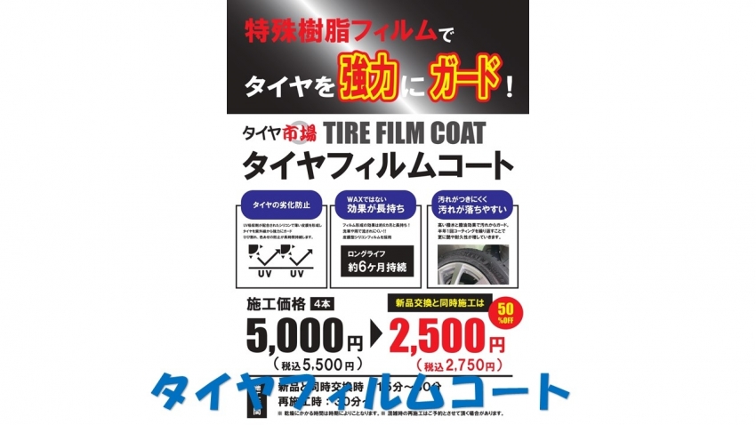 タイヤフィルムコートのお値段ですが、通常価格4ヶ所で税込5,500円ですが、タイヤ市場では税込2750円でやらせて頂いております!