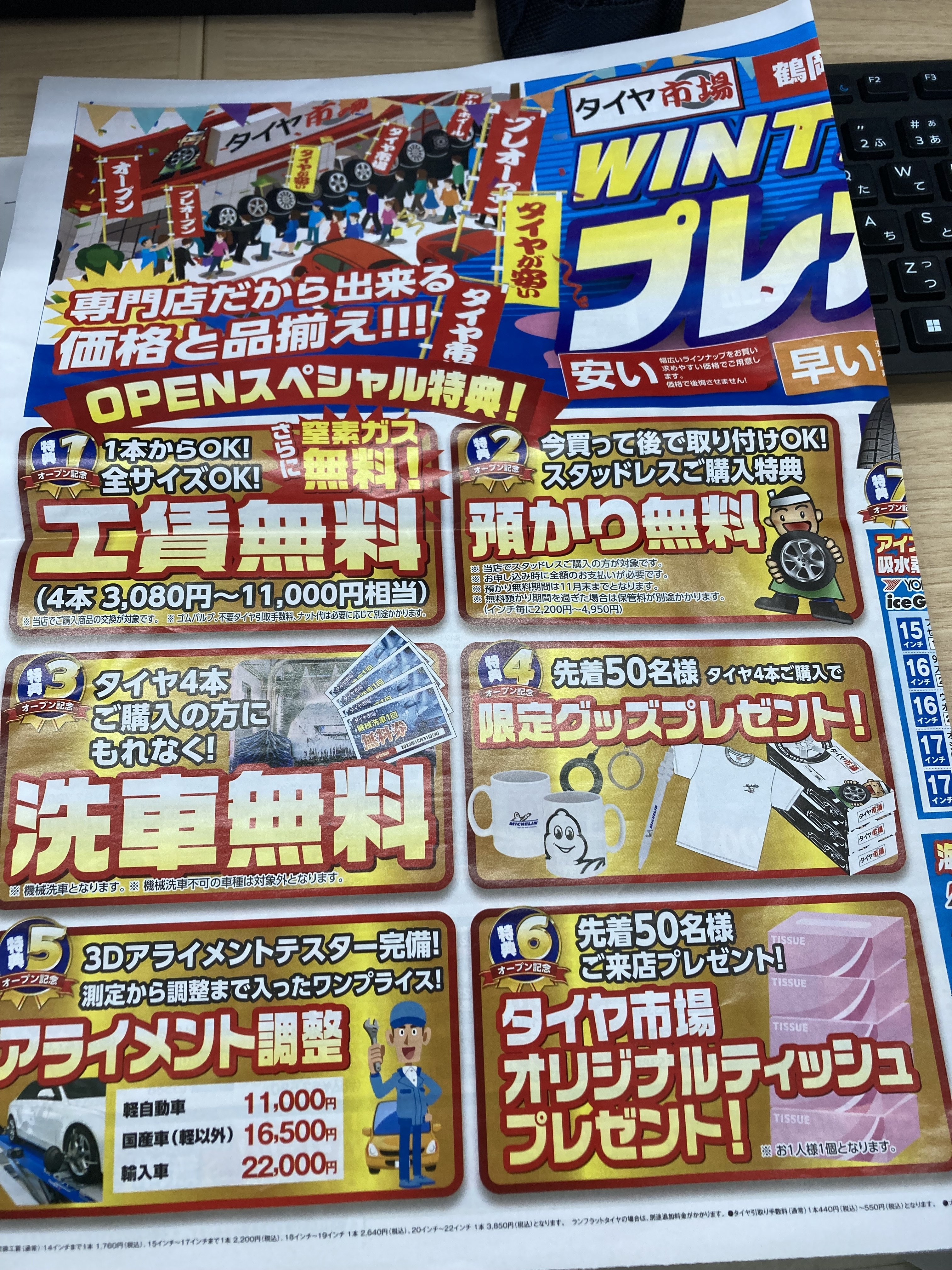 9/1~10/1までの期間オープン記念として全サイズ工賃無料やタイヤ4本購入で11月末まで預かり無料や先着50名様に限定グッズをプレゼントしておりますので是非期間限定にタイヤご購入して頂きたいと思いますので気軽にタイヤのことご相談下さいませ!