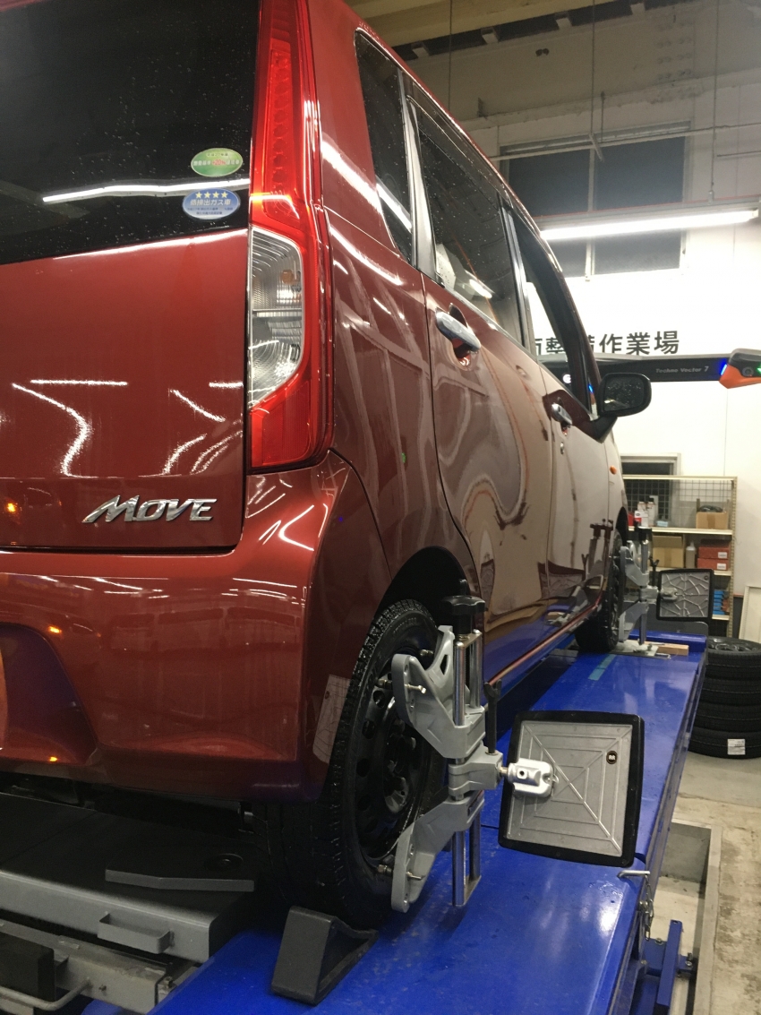本日は、車検でご入庫のダイハツ ムーブのアライメント調整をさせて頂きました。