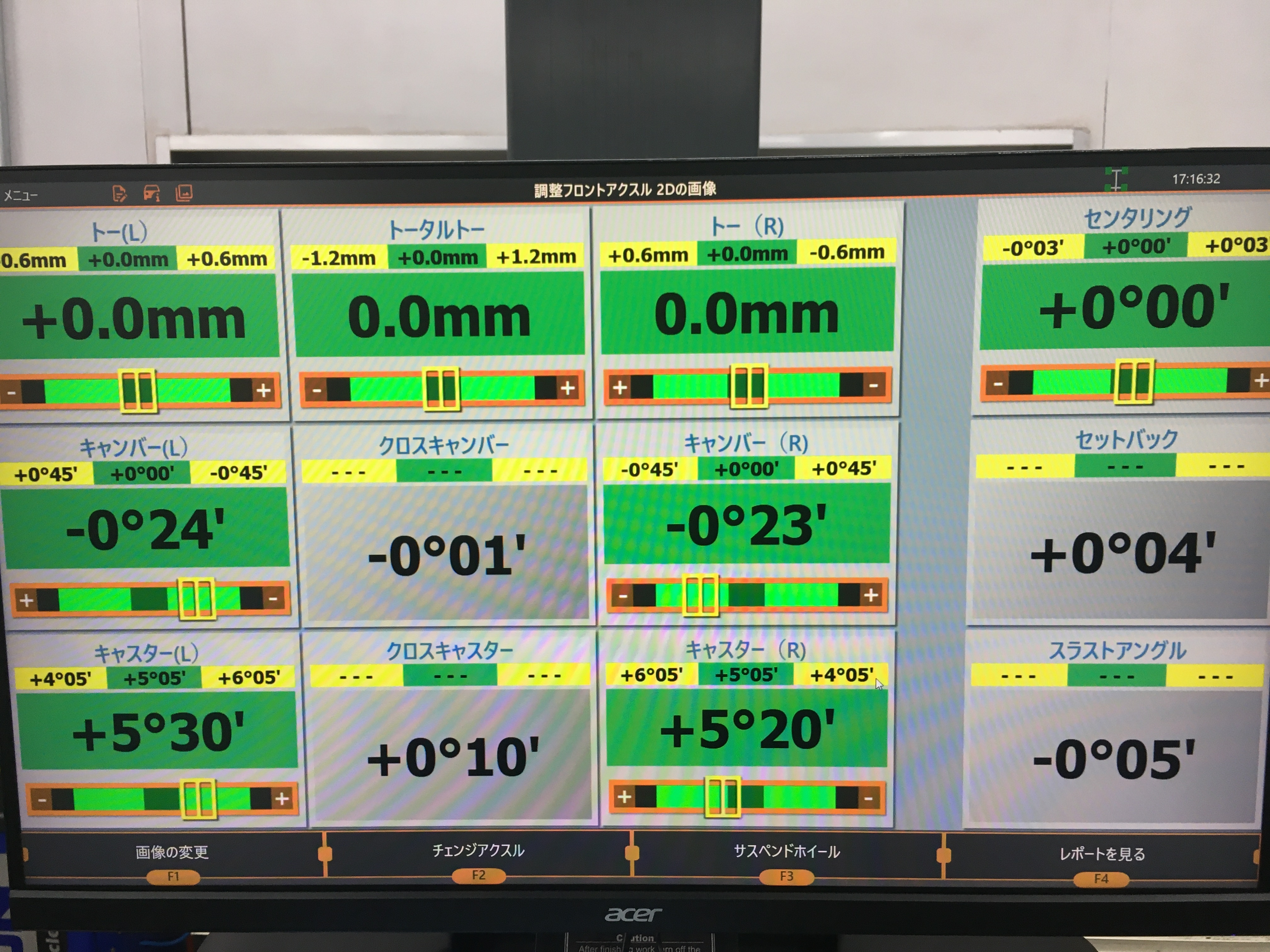 フロント足回り部品、ロアボールジョイントブーツ交換を行った為、調整が必要となりました。