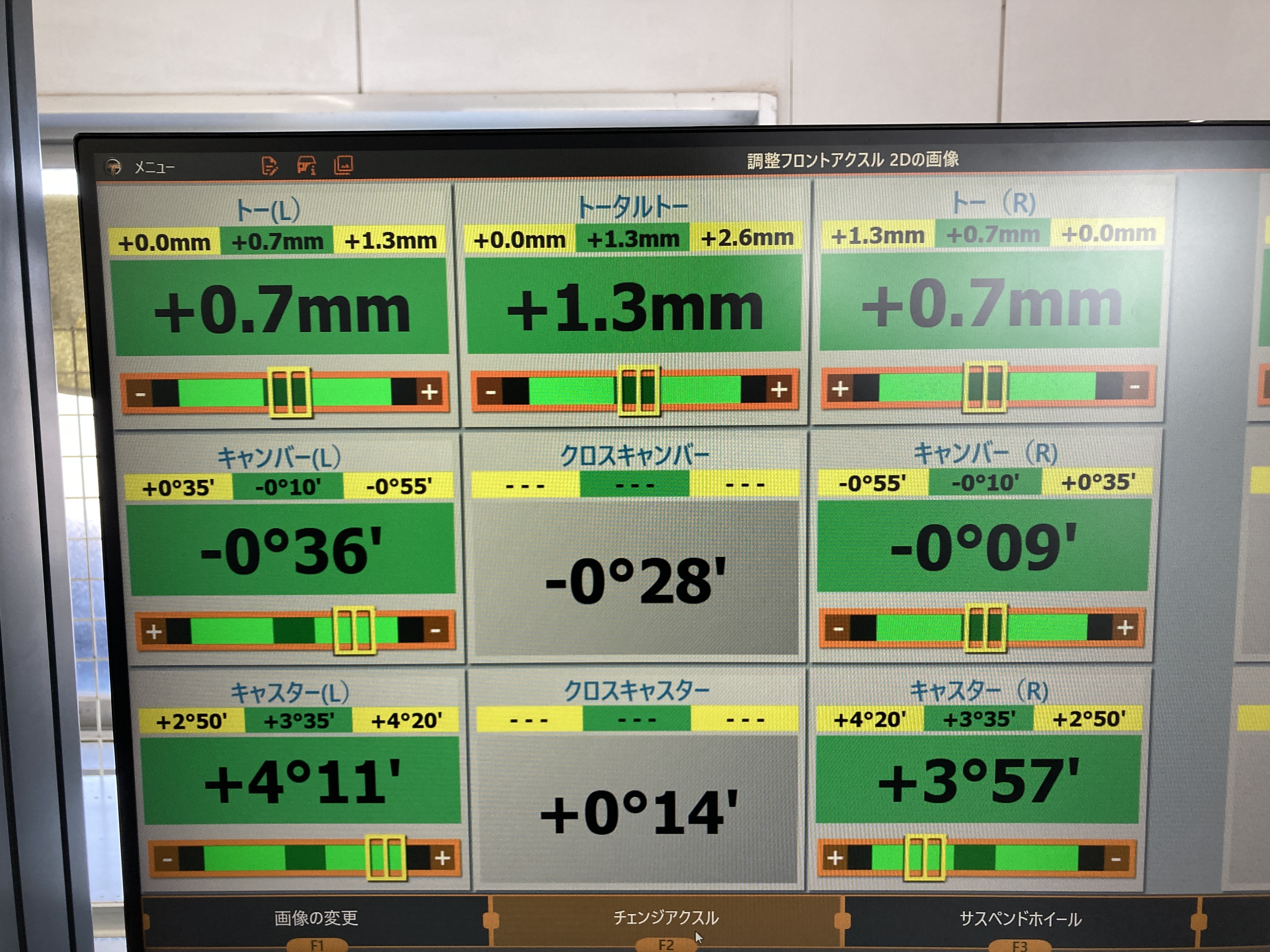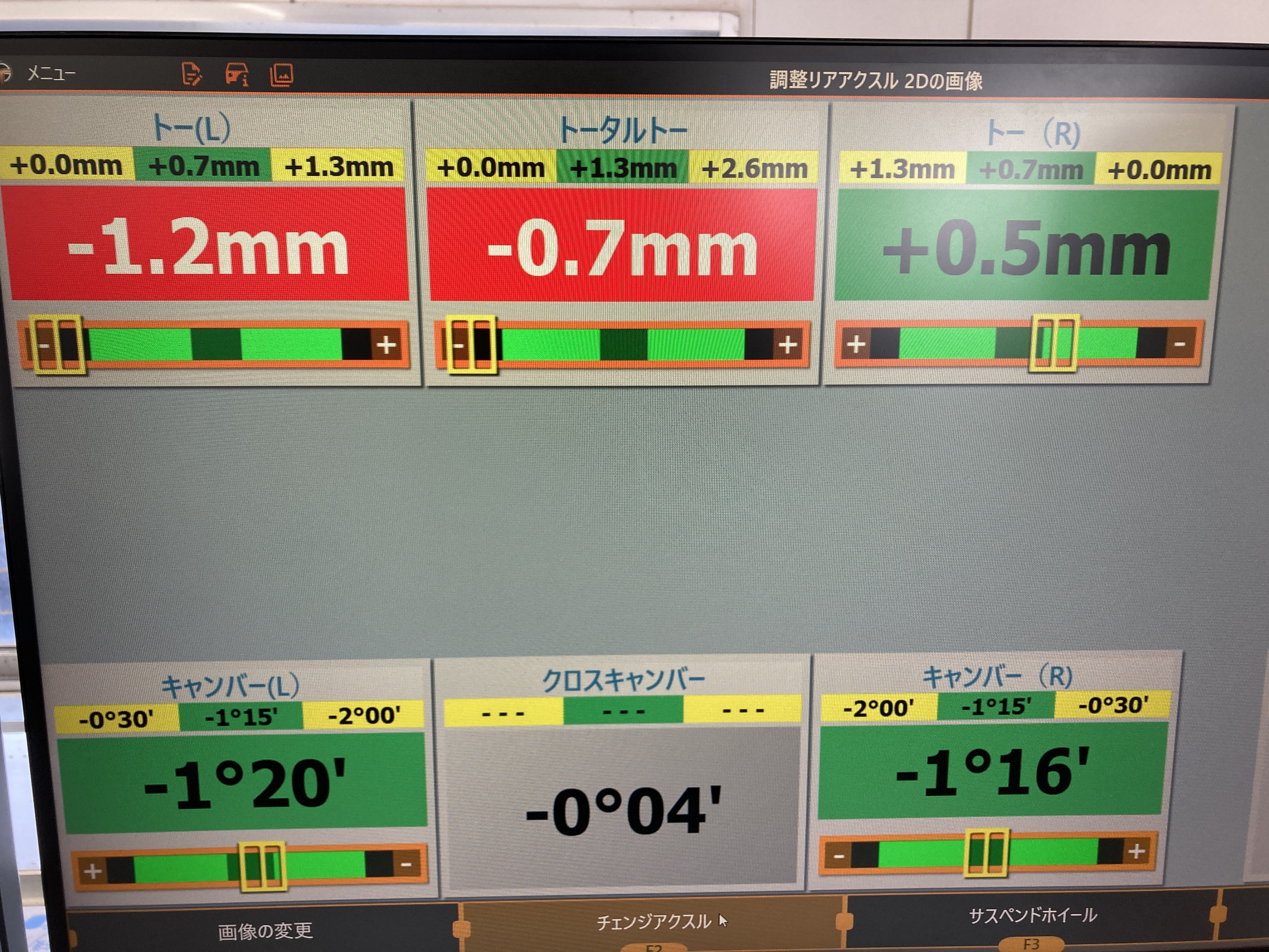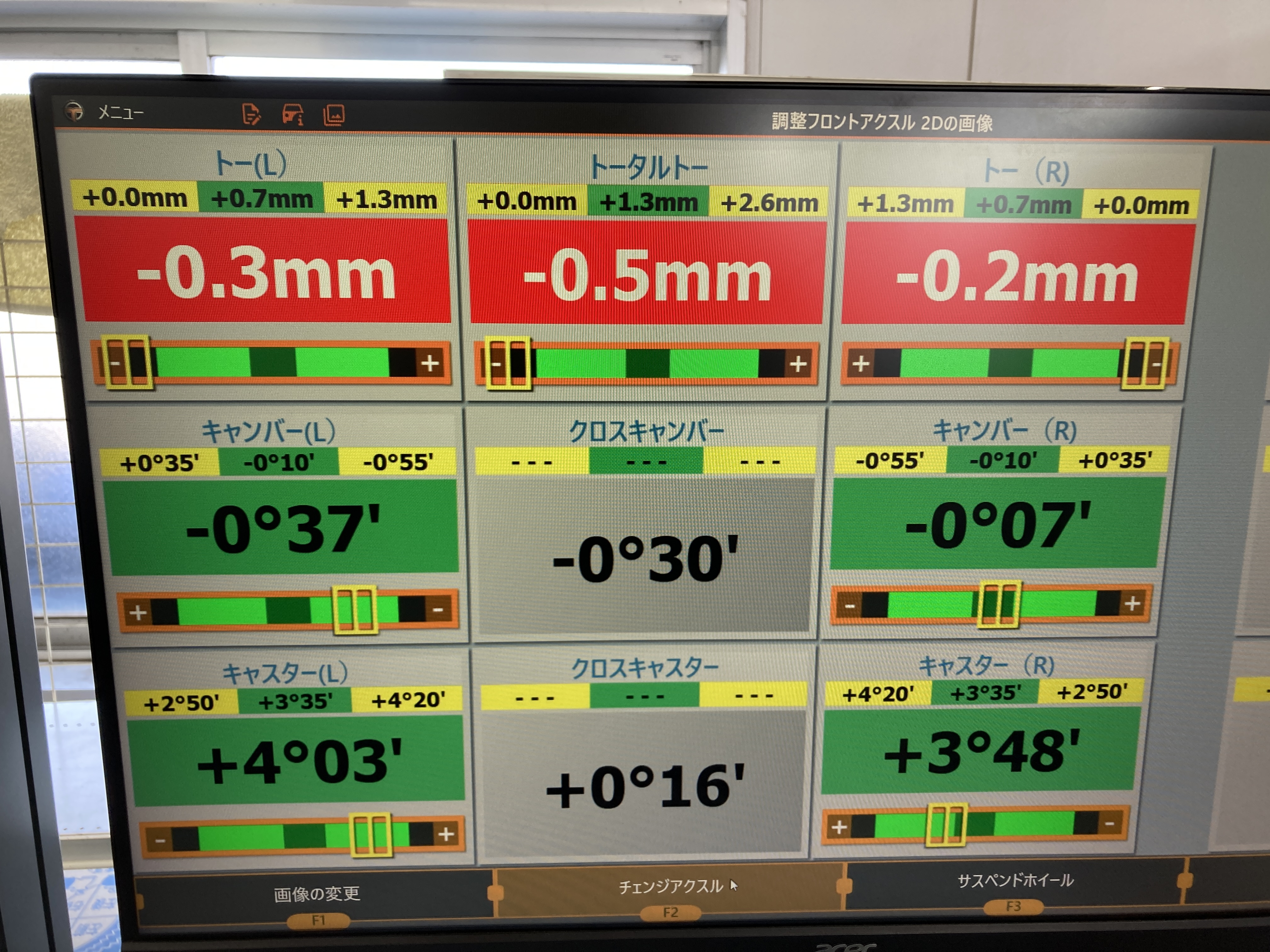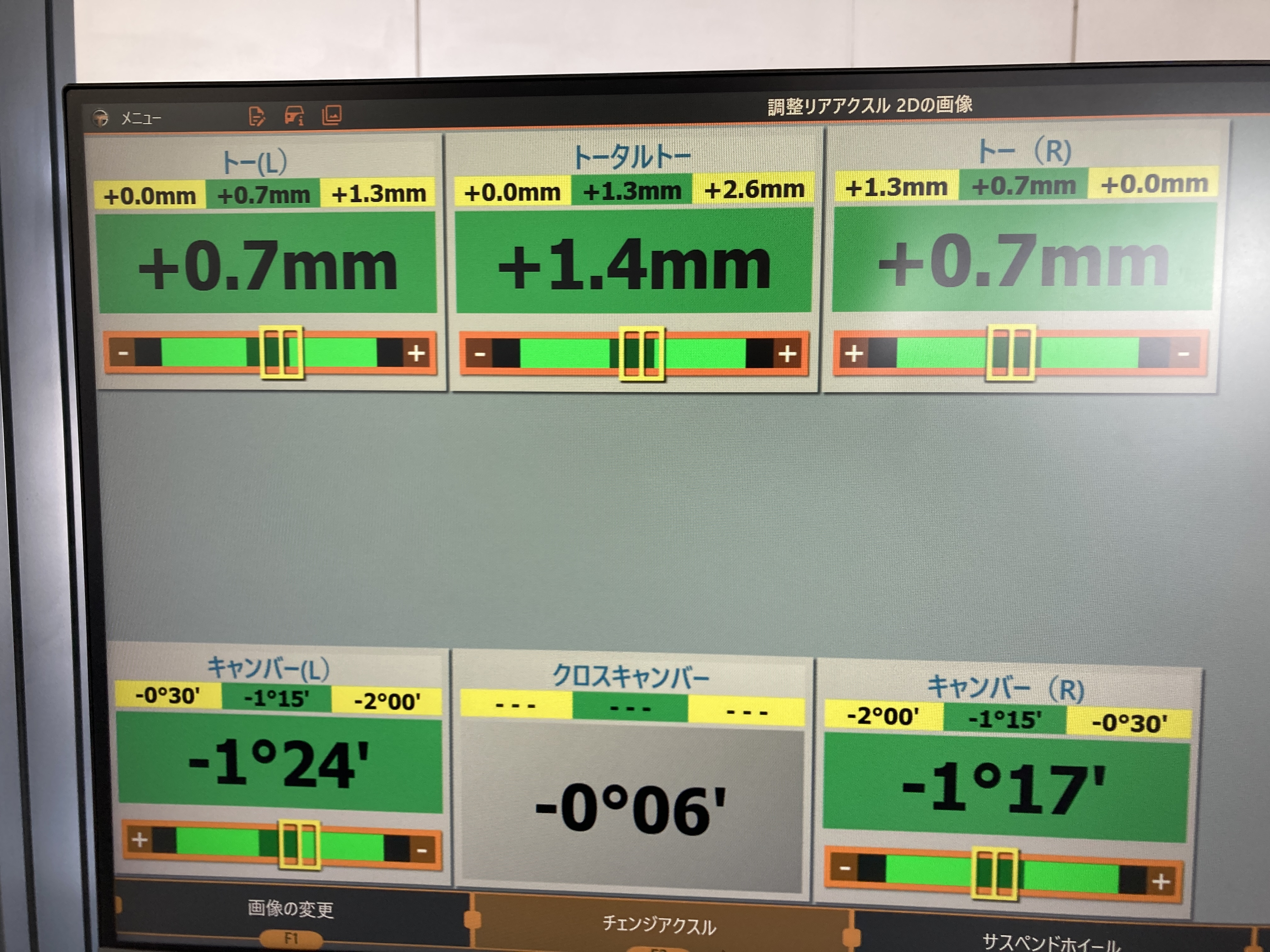 測定した数値の通り、アライメントに狂いがありましたので、メーカー基準値の真ん中に調整致しました!
