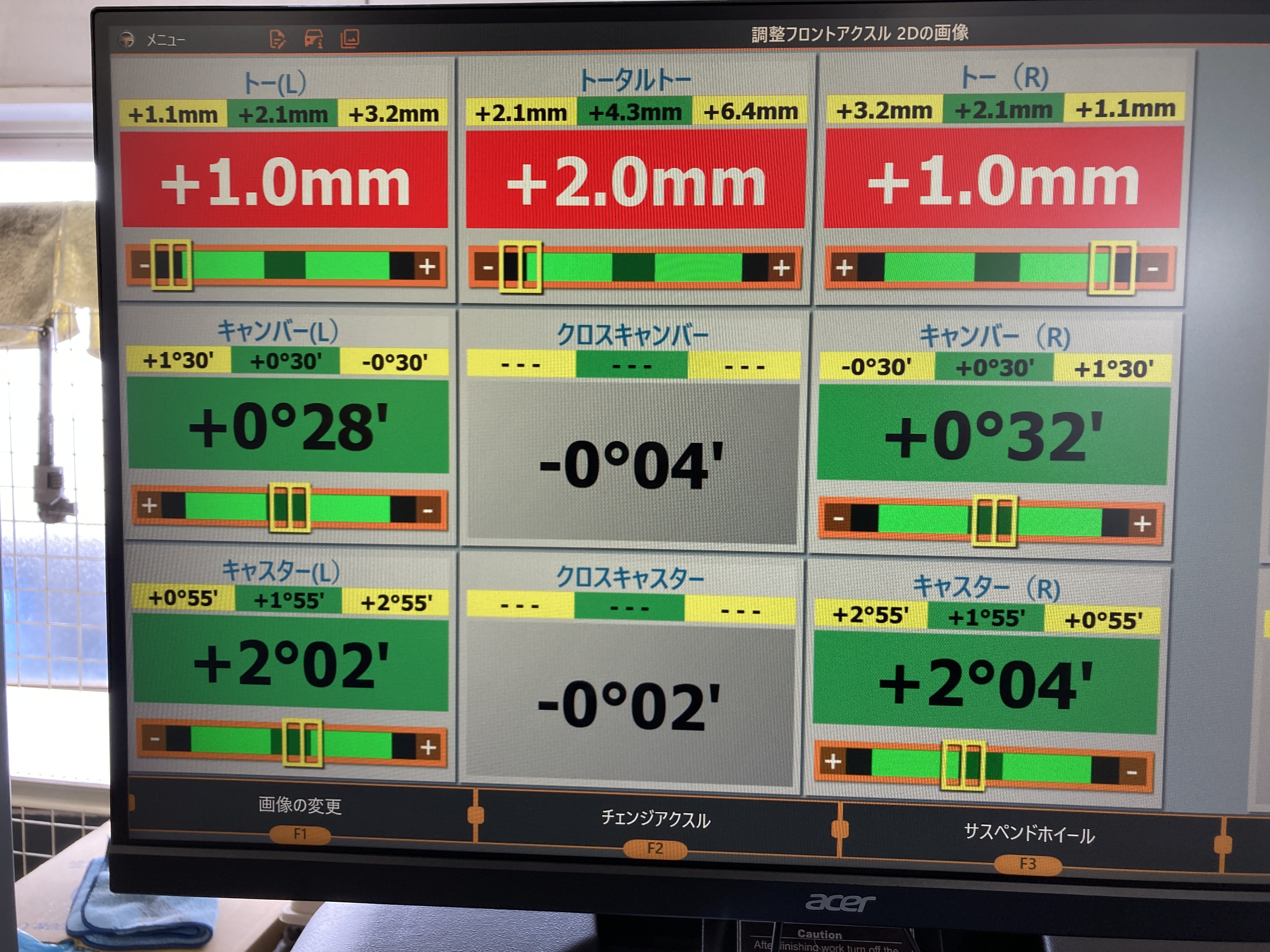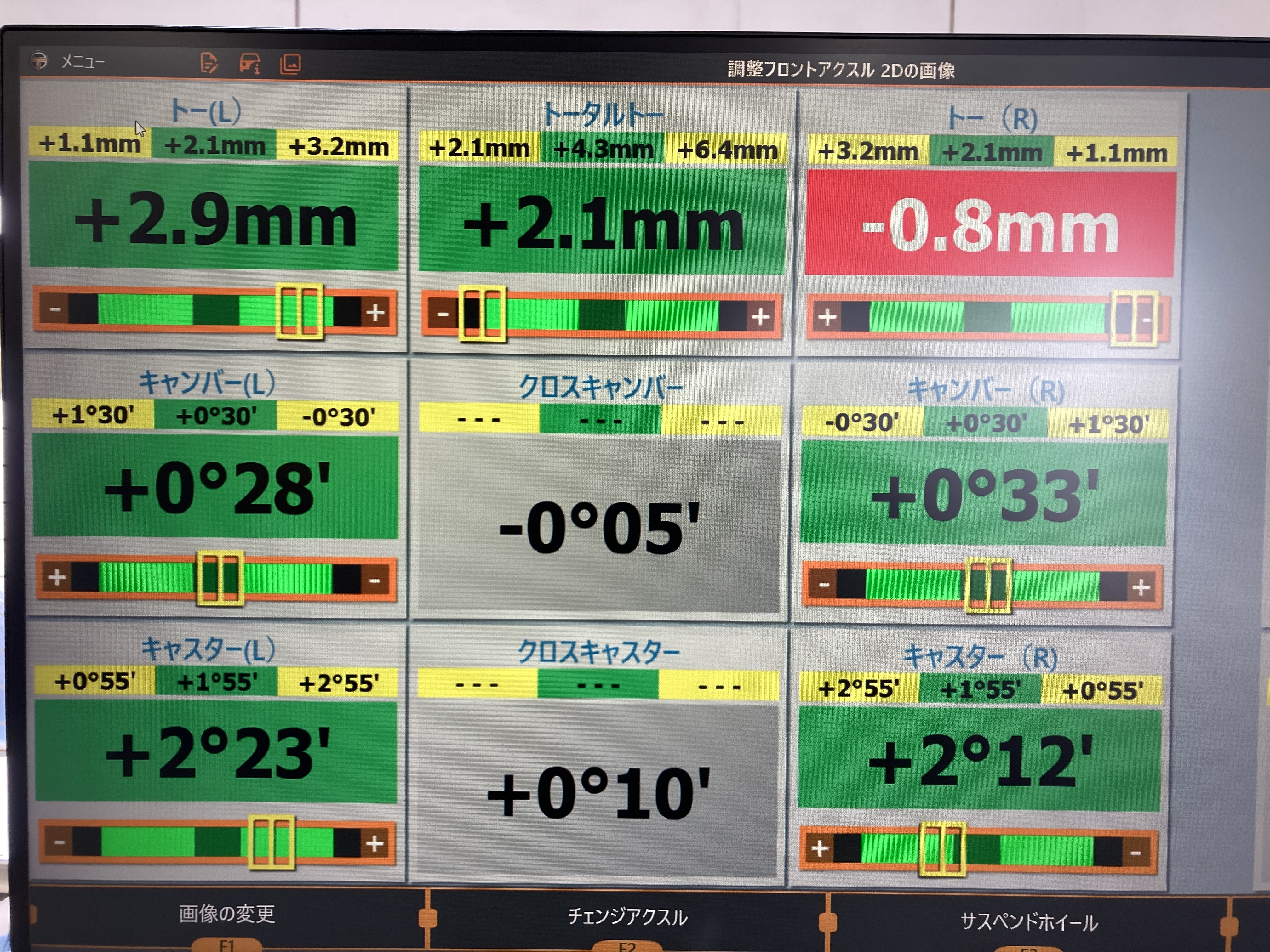 数値を見てわかる通り、フロント左側のトーがかなり中に入っているのがわかります。