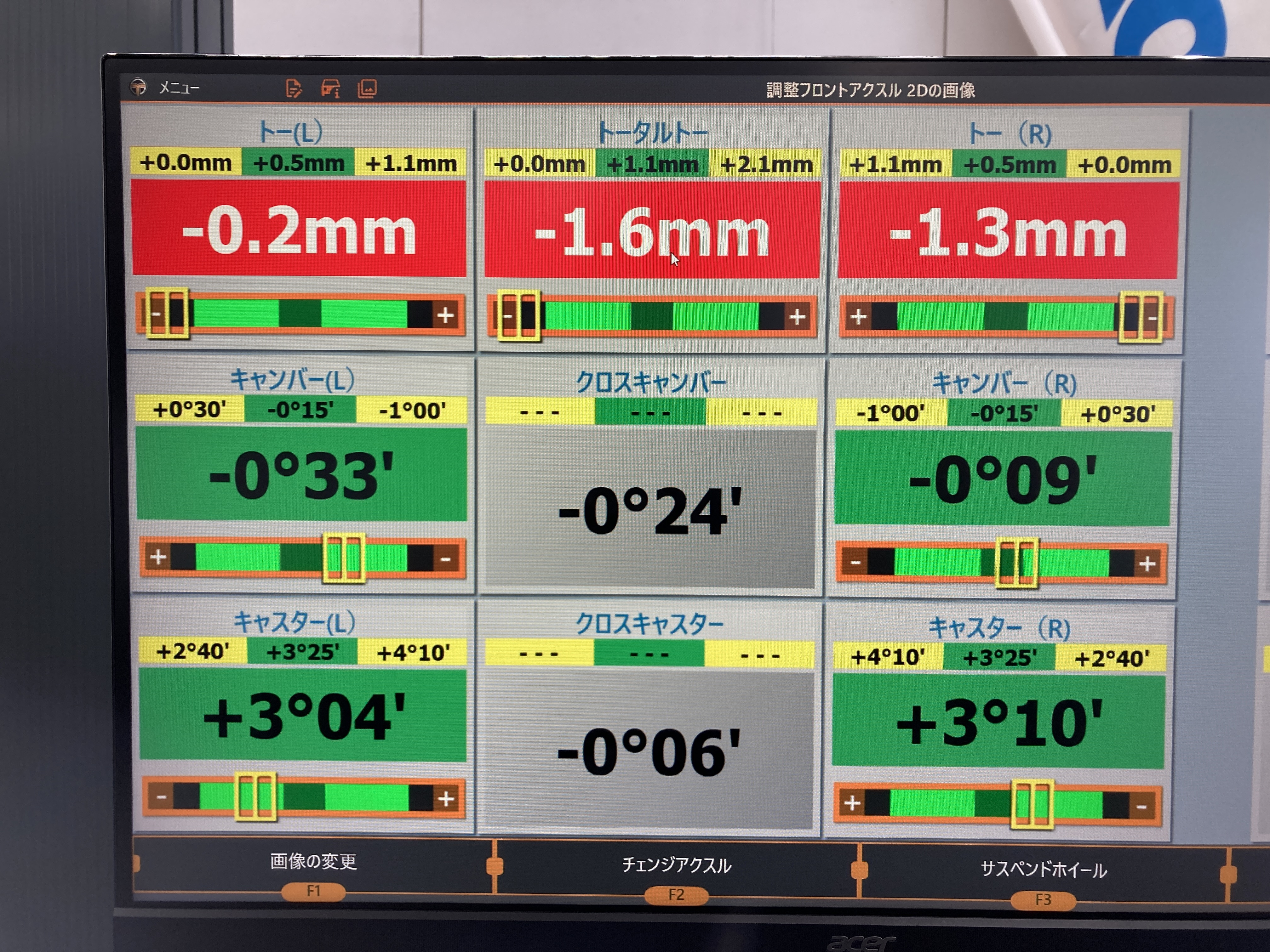 トーだけを見ると右にハンドルが持っていかれそうなんですが、数値上で問題がないキャスターのズレが大きく現れていました。