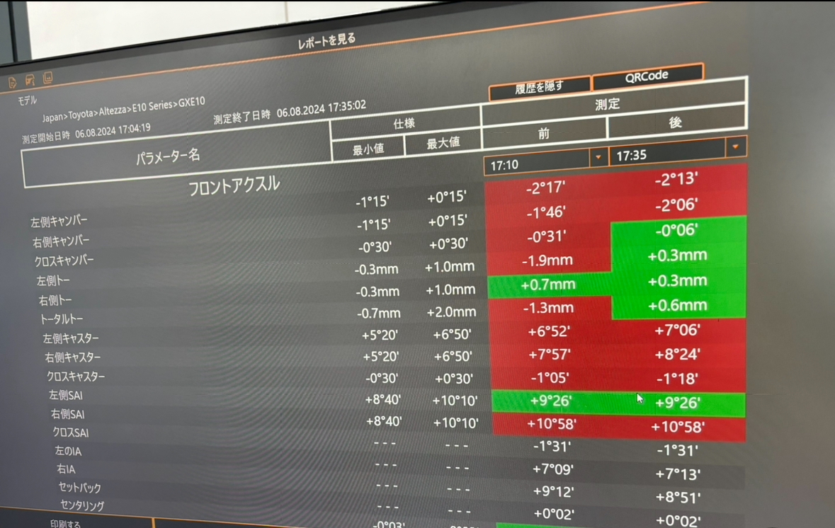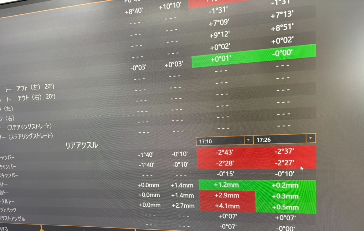 調整箇所はリヤキャンバー、リヤトー、フロントキャンバー、フロントトーの