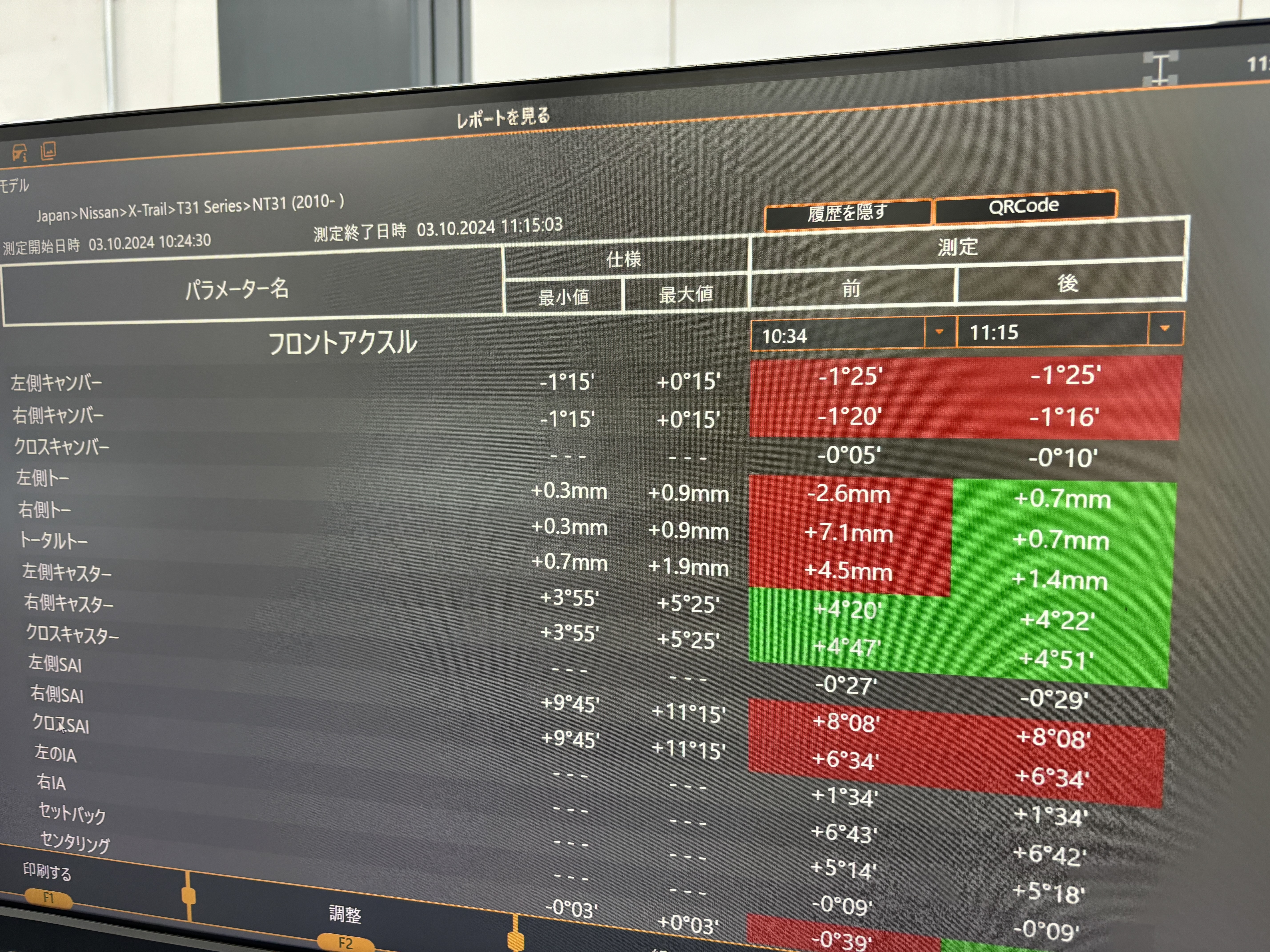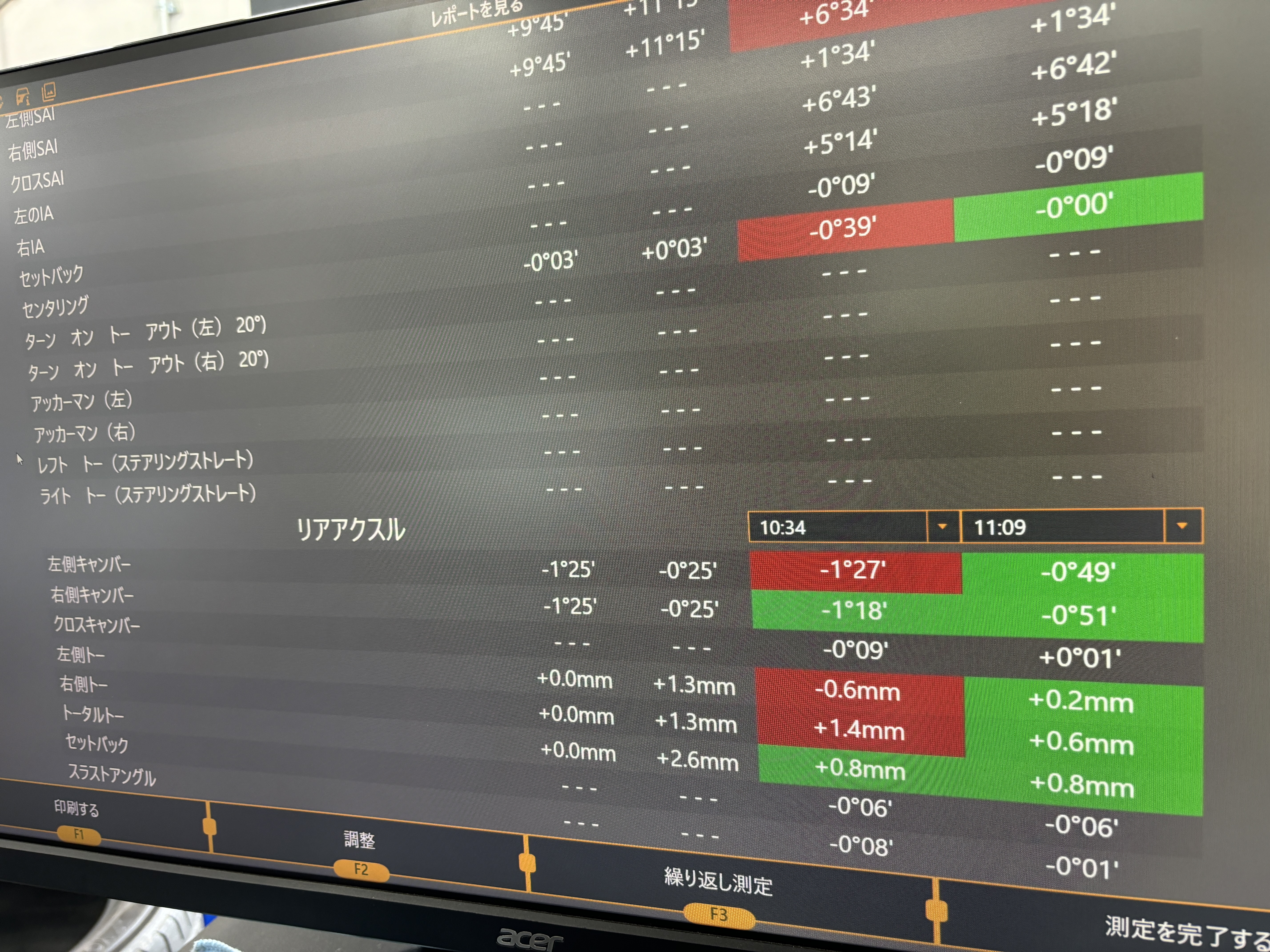 測定をかけてみると数値がバラバラになっていてハンドルセンターもズレていました、、