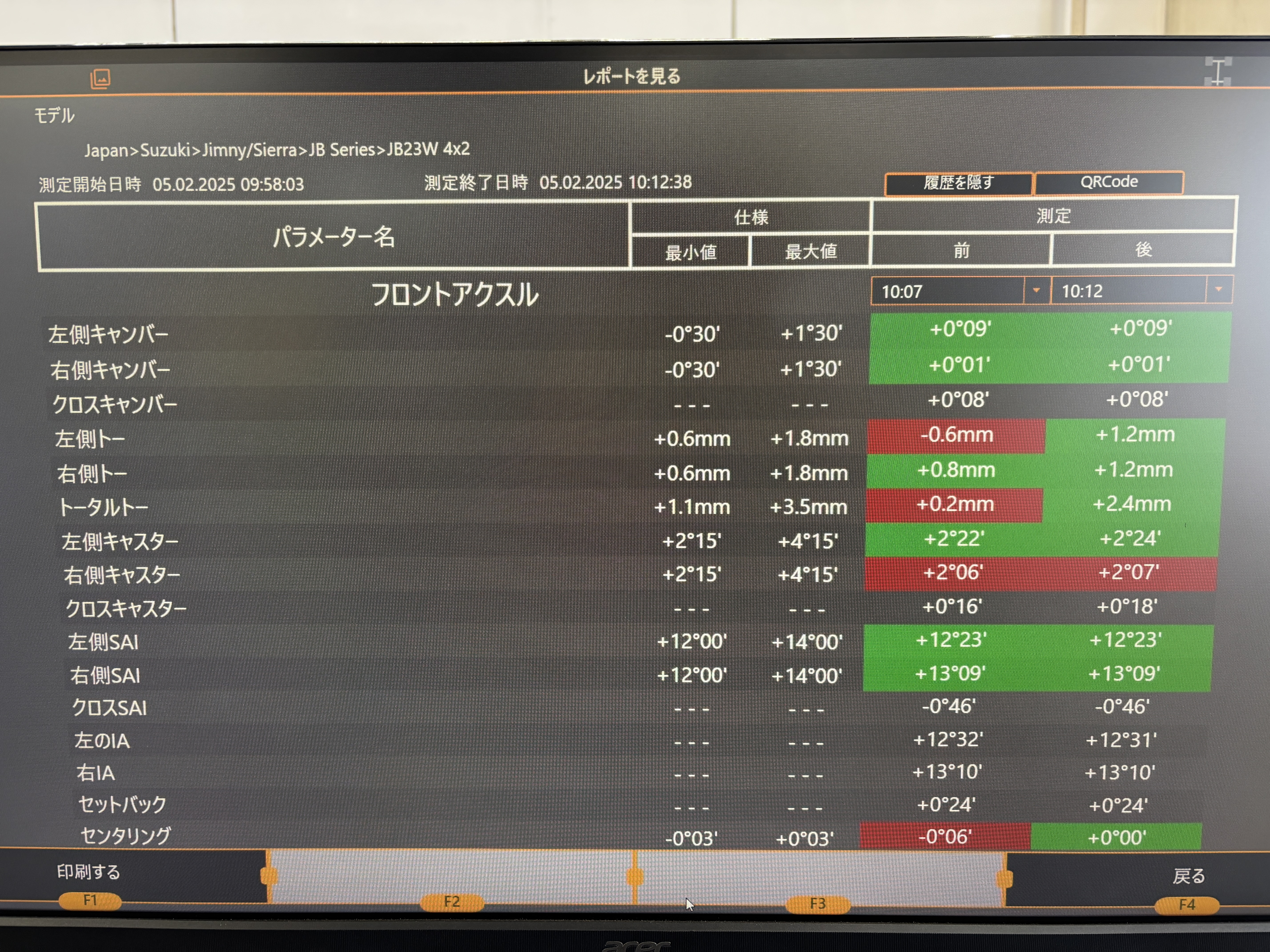 数値を見るとフロント左が基準値よりも外側に開いている状態になっていました💦