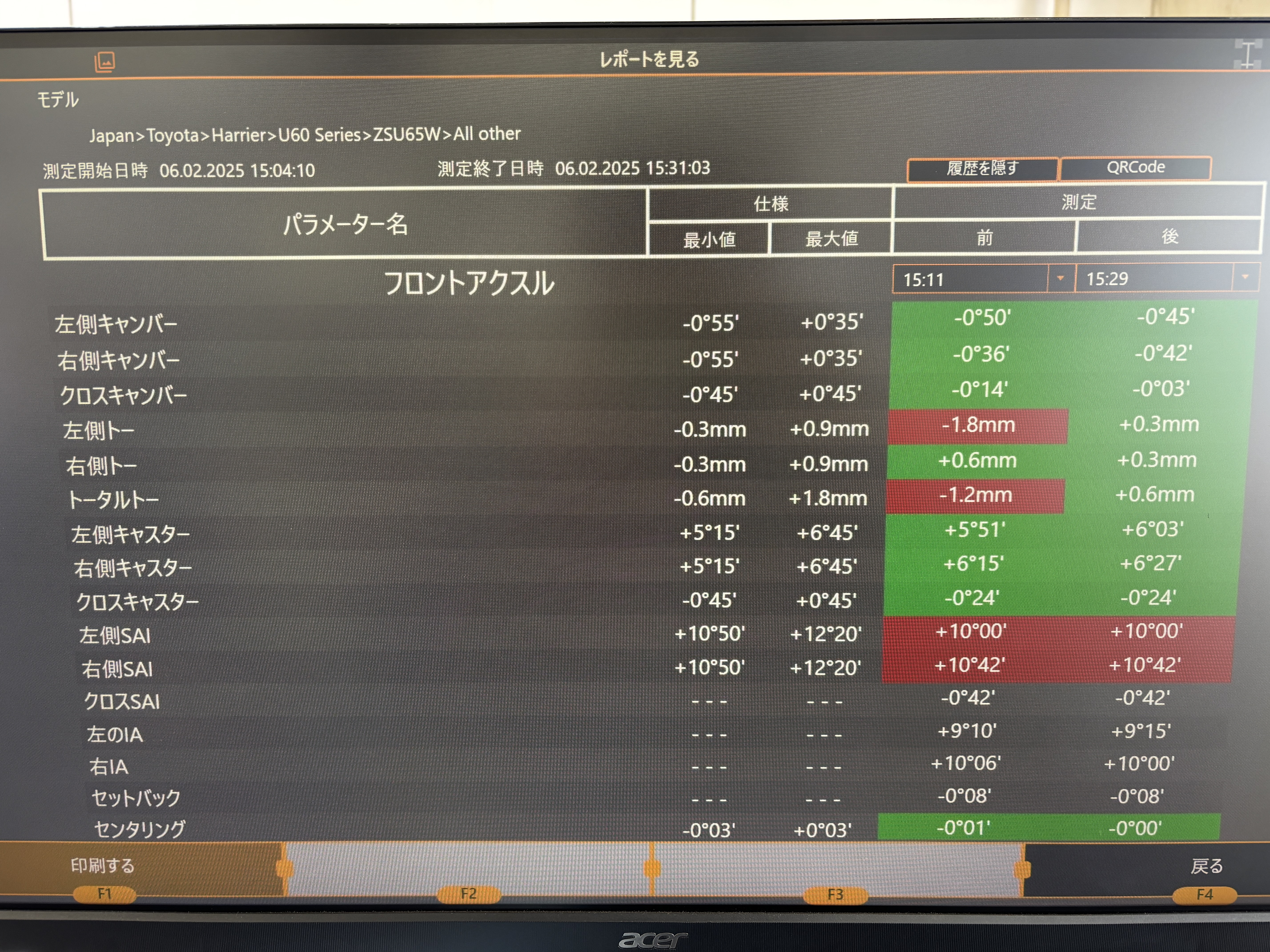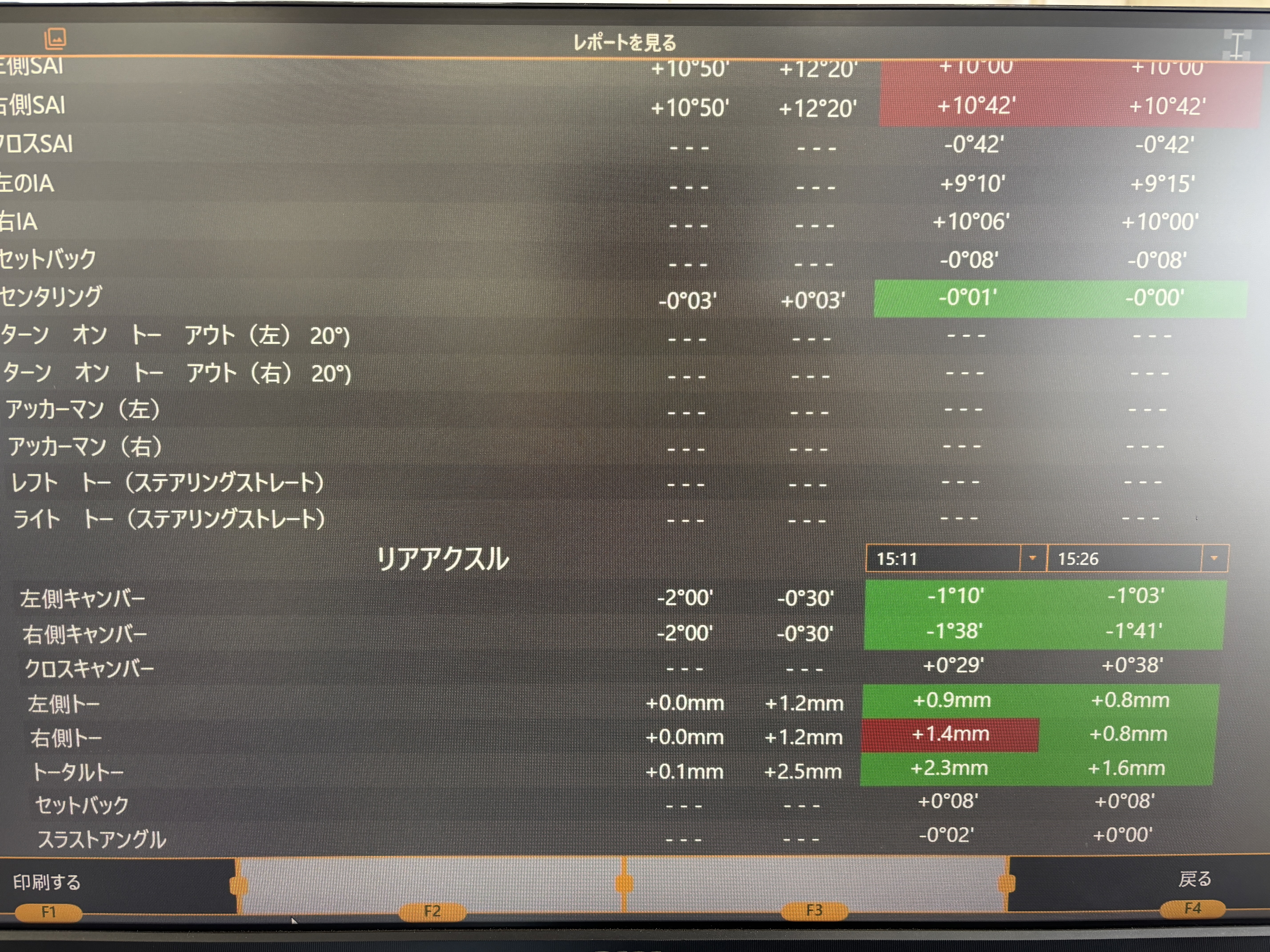 数値を見るとフロント左とリヤ右が基準値よりズレている状態になっていたため