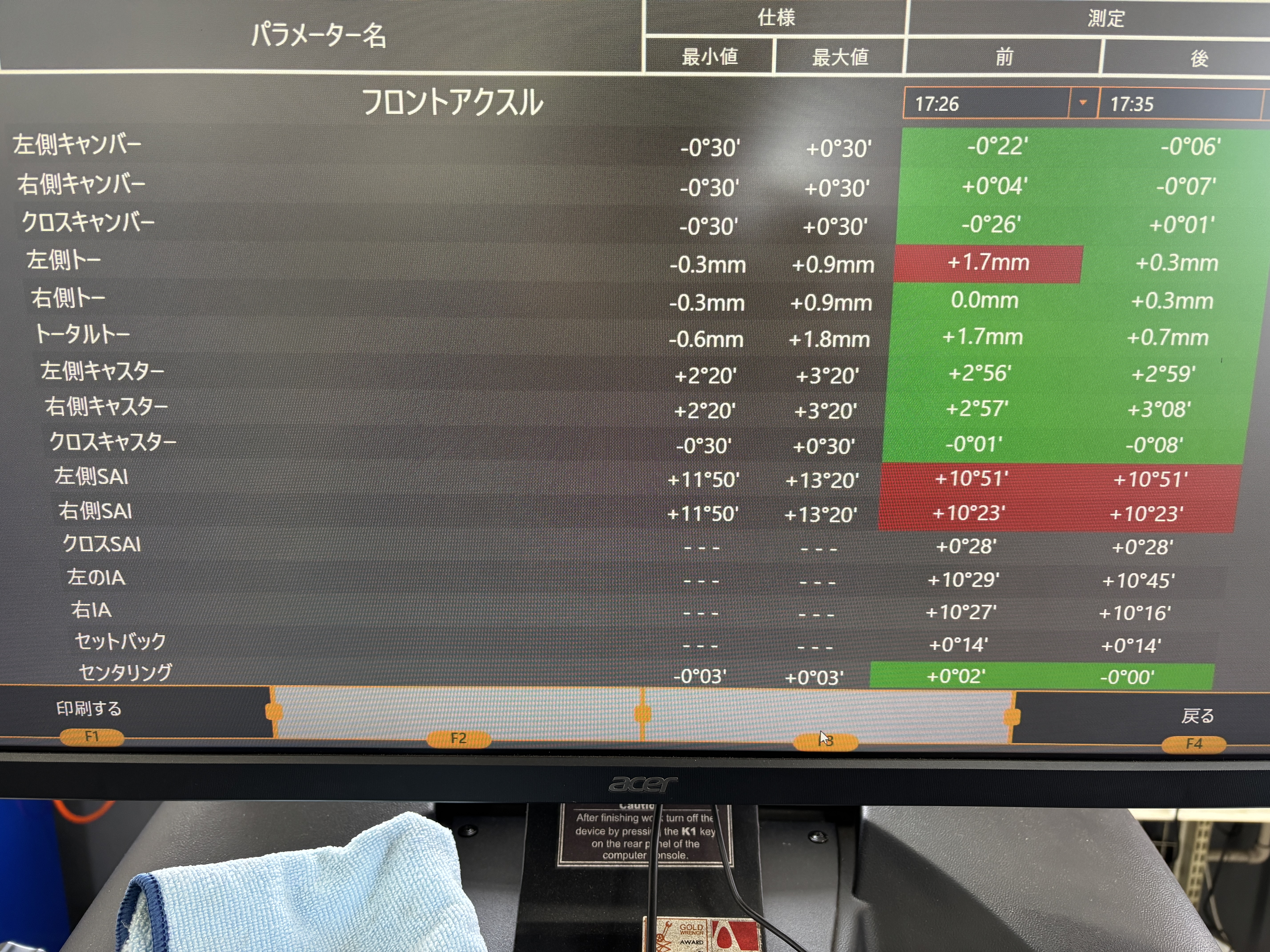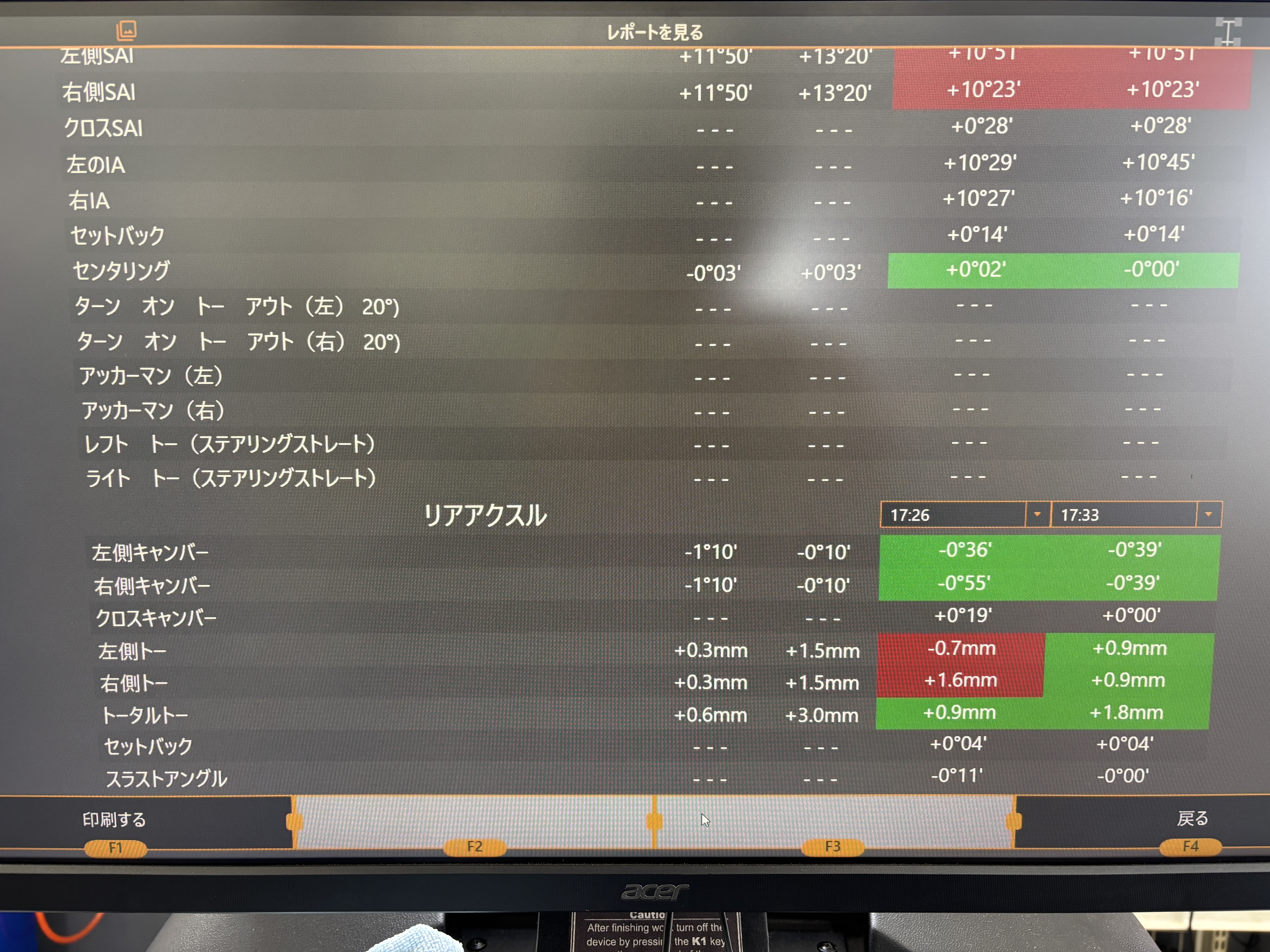 リヤキャンバー・リヤトーの数値を揃え、フロントトーを基準値に揃えて調整完了になります!