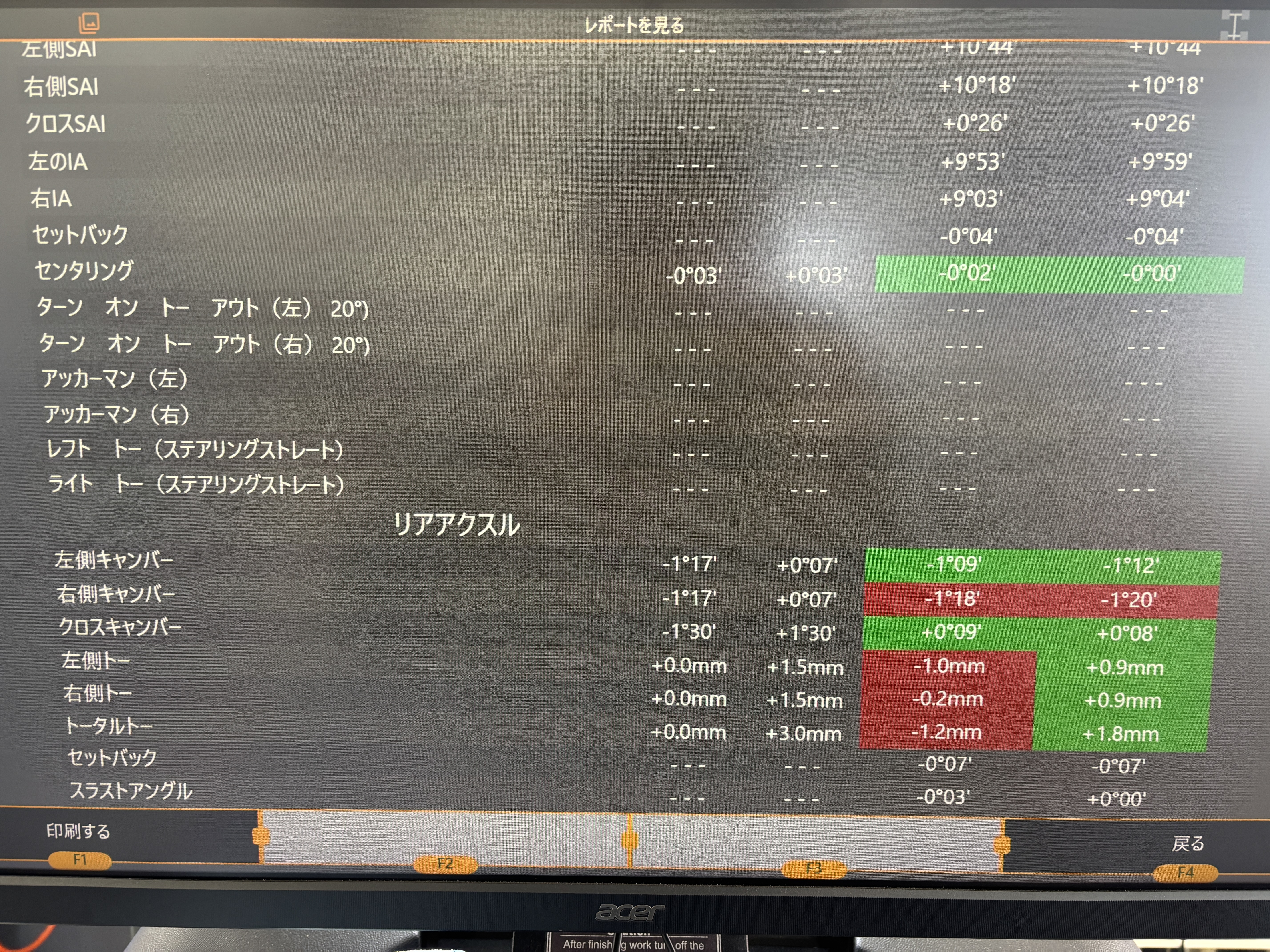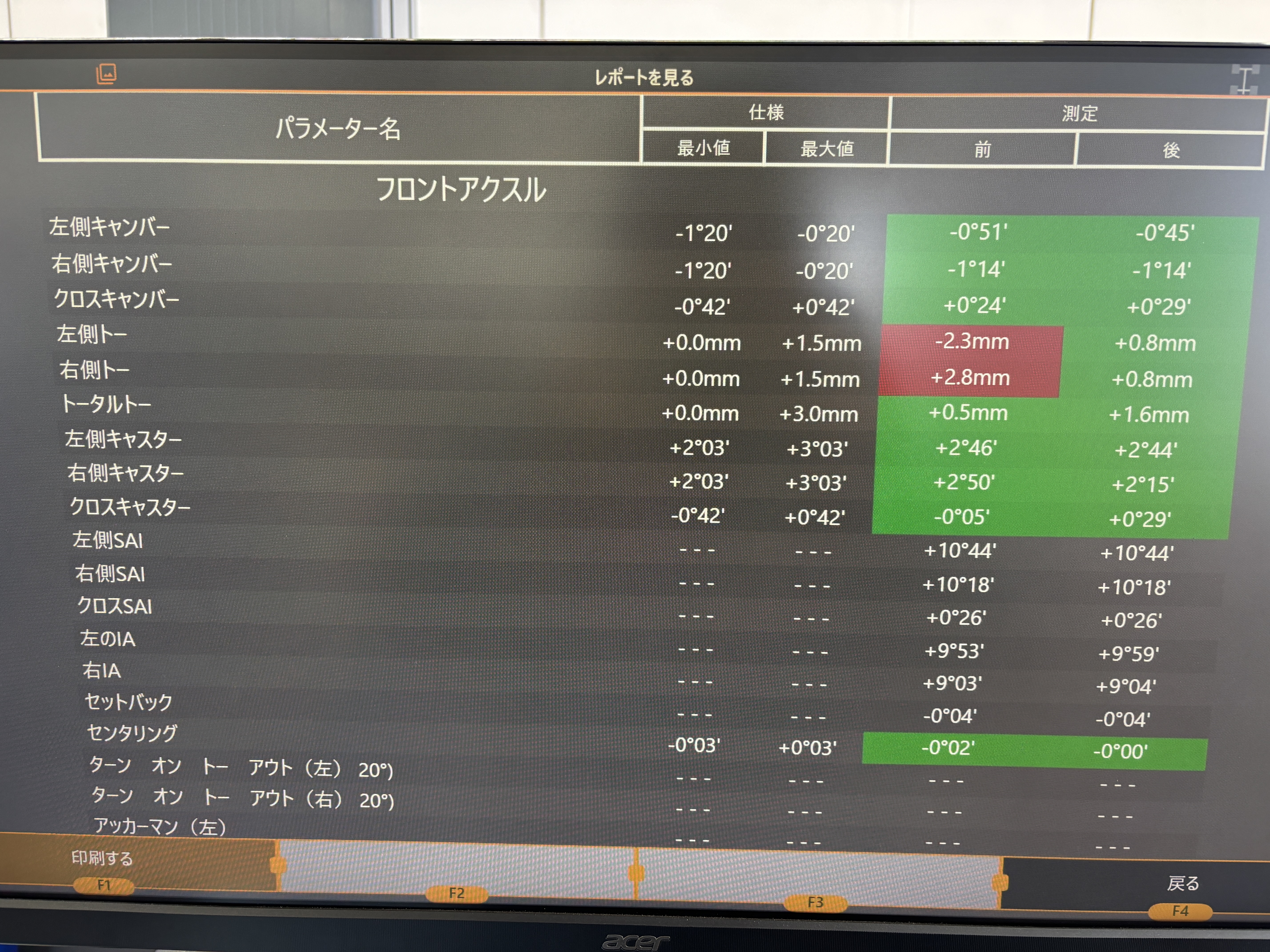 リヤ・フロント両方とも数値がバラバラでハンドルセンターもズレていました💦