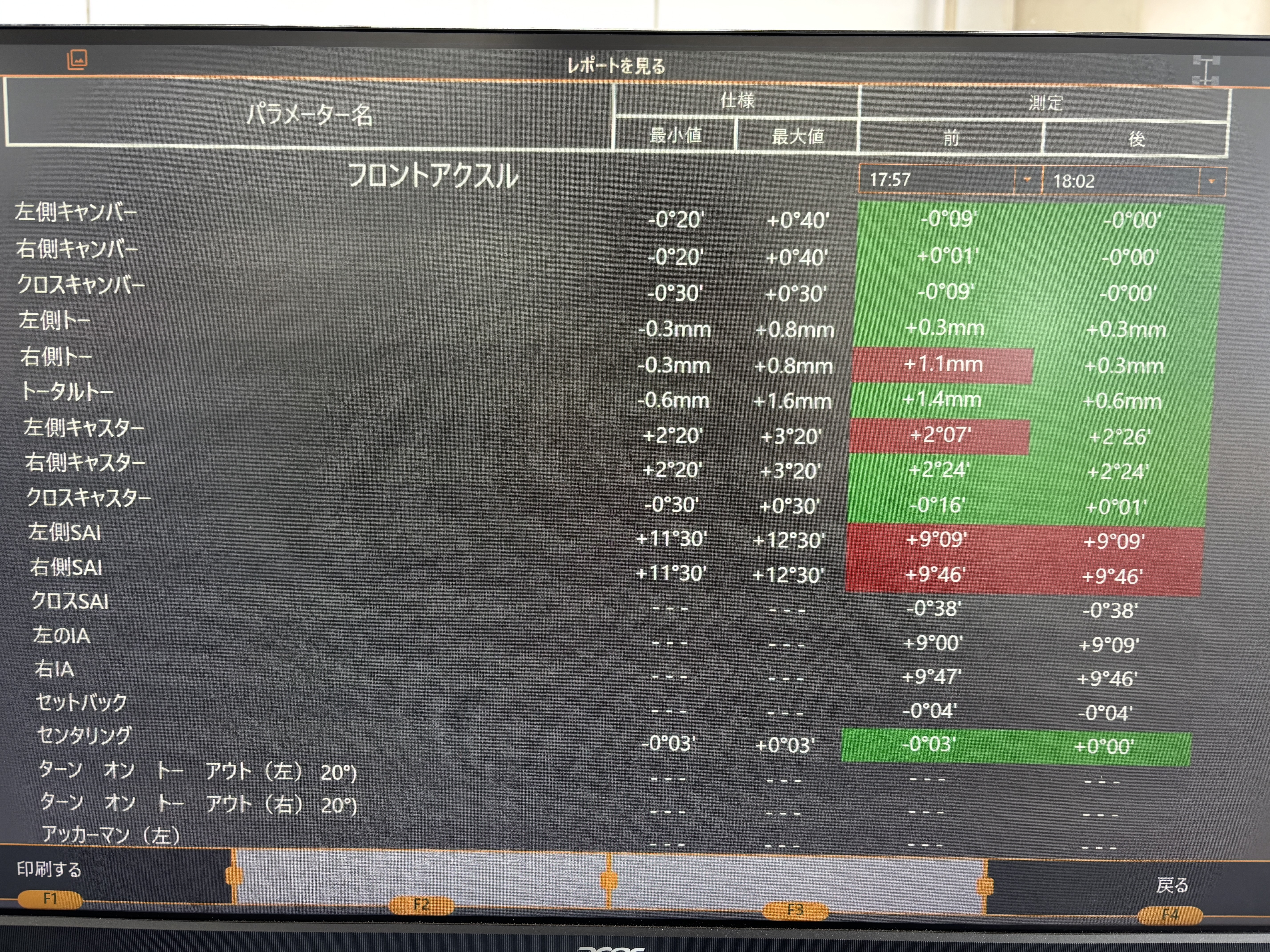 調整を行いトー角も基準値よりも内側に入っている状態でしたので