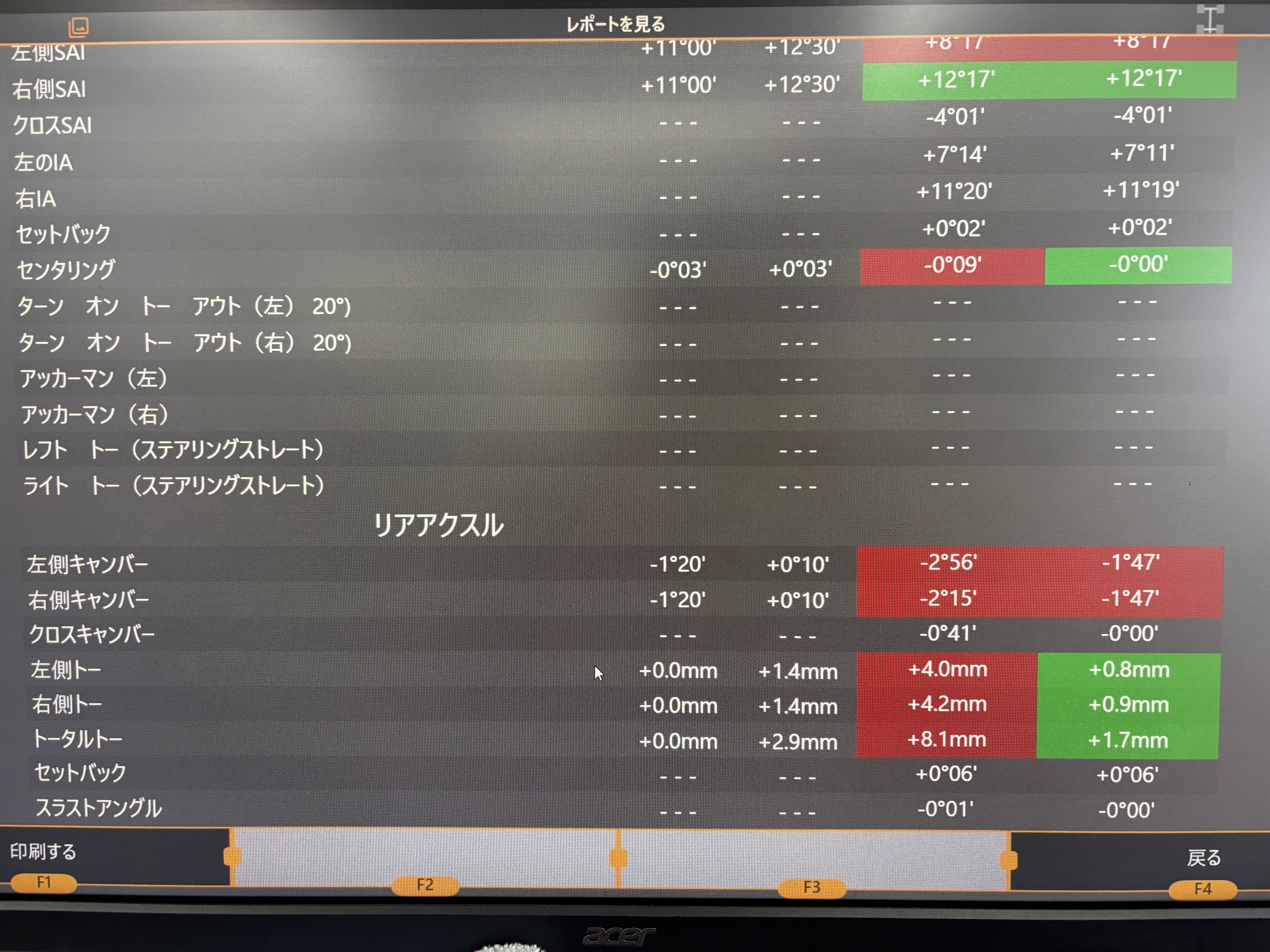 リヤキャンバー・リヤトー・フロントトーが基準値よりかなりズレている