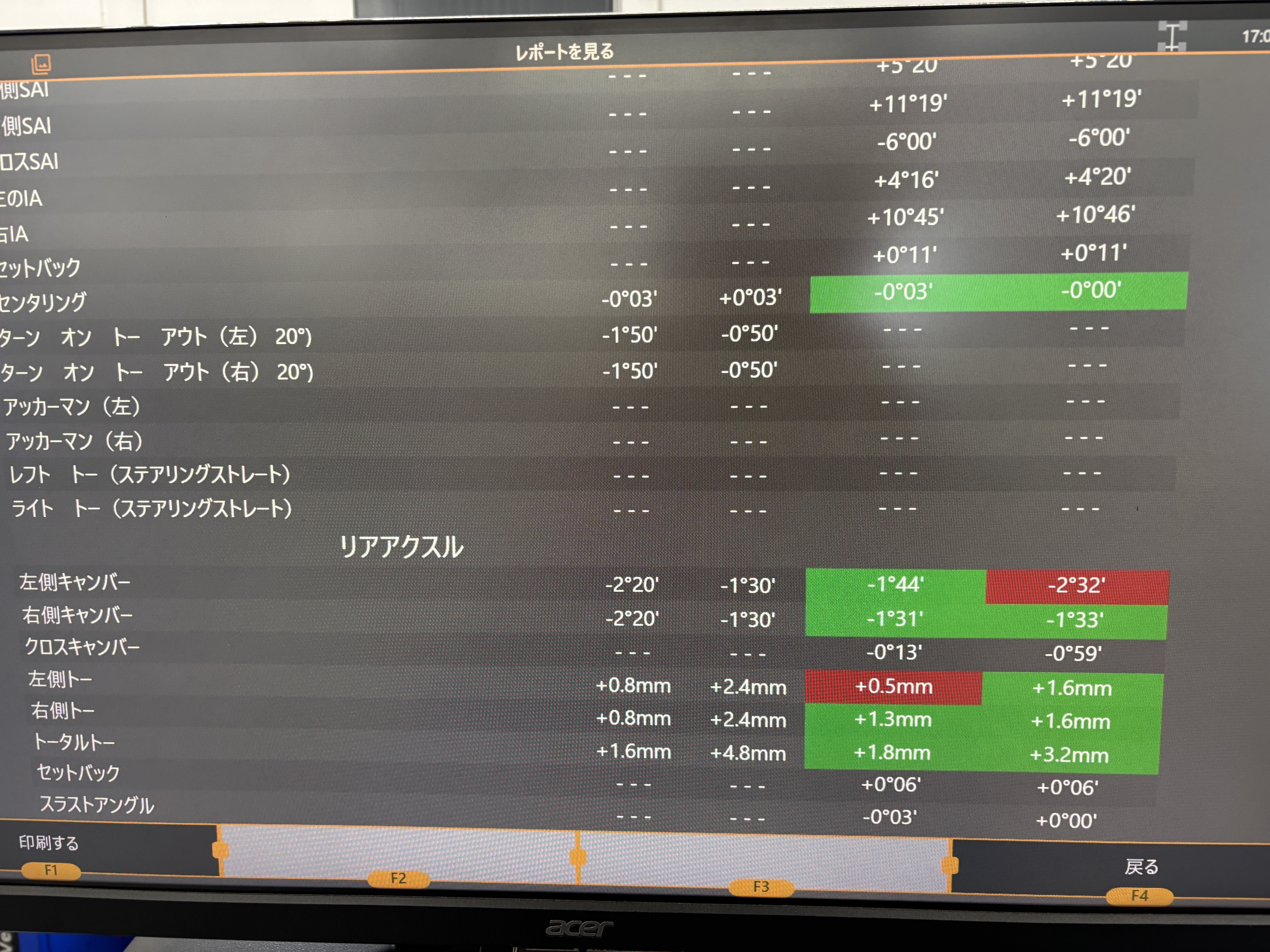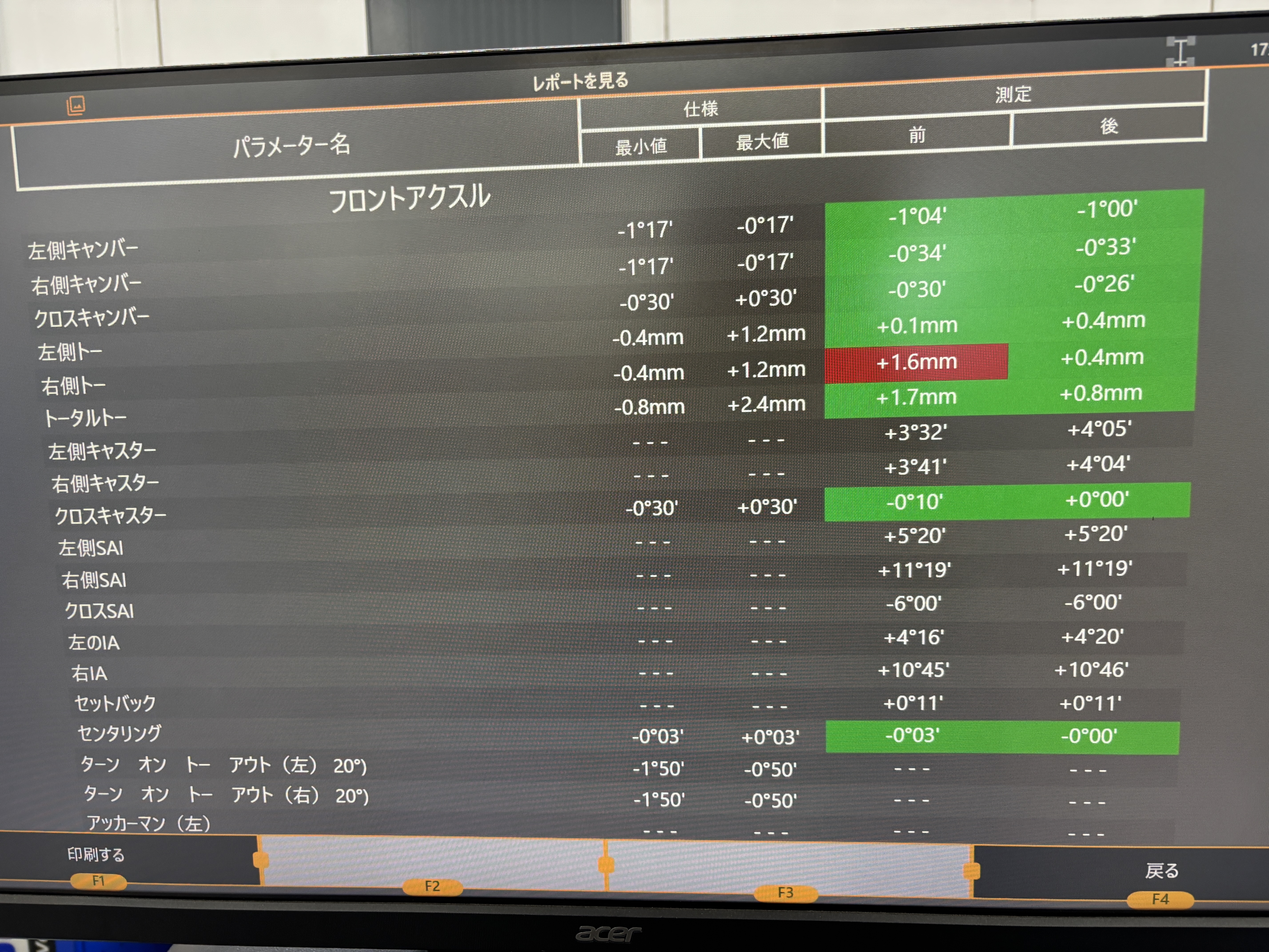 数値を見ると基準値から外れていたためリヤトー・フロントトーともに