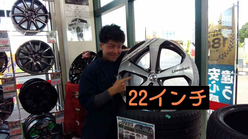 記念に22インチのホイールと1枚パシャリ頂きました。 22インチともなると大きいですね!!尚且つ重い・・・ 当たり前ですが(笑) ぜひぜひ22インチなど幅広く展示しておりますので遊びに来てくださいね!!