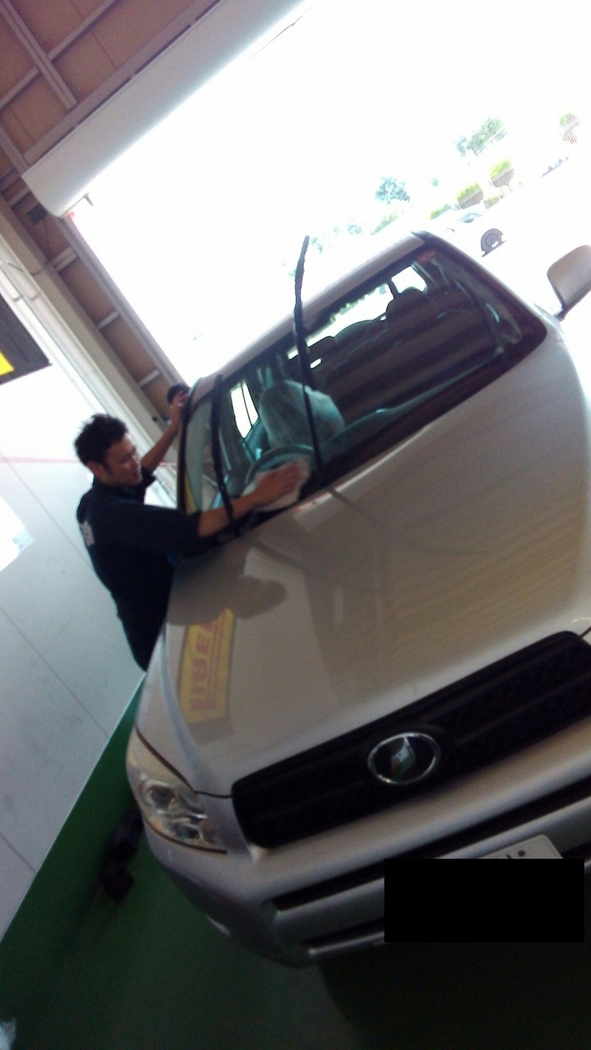 ラブ4のお客様のフロントガラスコーティング作業です。これからの梅雨を考えると今が時期的にぴったりですよね!?