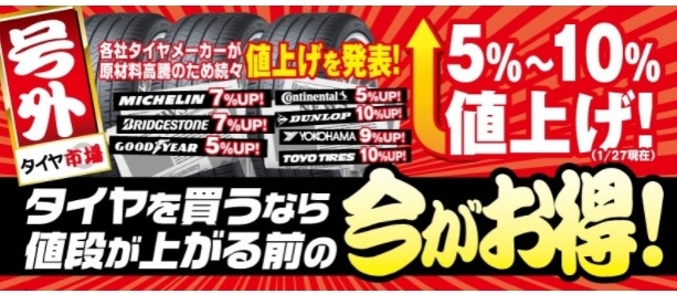 また、各メーカーとも4月からタイヤの値上げを致します。