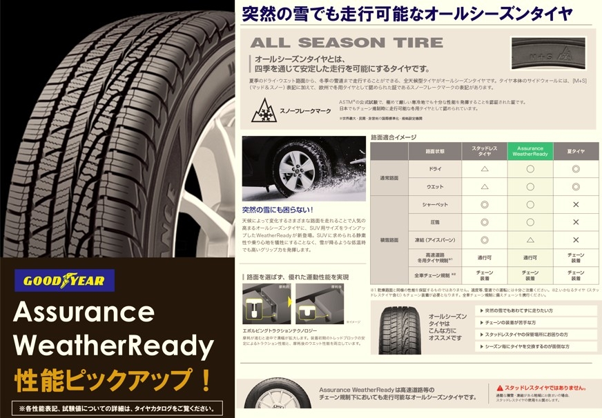 グッドイヤーのオールシーズンタイヤ。特価商品のご紹介!ウェザーレディが安い!オールシーズン買うならタイヤ市場宇都宮南店へ