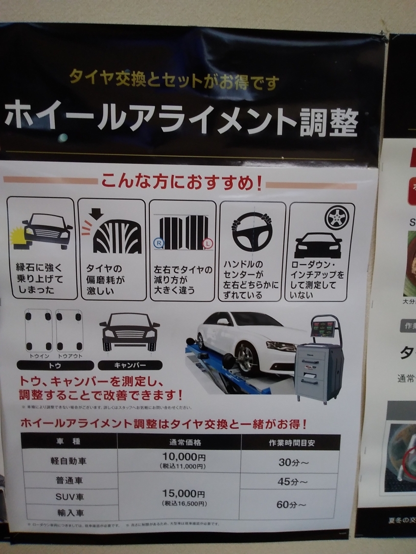 長く乗ってきた車は、タイヤの取り付け角度にだんだんとズレが生じてきます。 長年乗っていて、これまでアライメントの調整をしたことがなければ、タイヤ交換時にアライメント調整をすることをお勧めします。