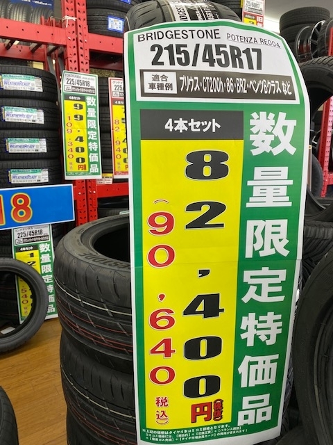 86、BRZ、カローラスポーツなど215/45R17装着 カジュアルスポーツタイヤをお求めの方に!特価品ブリヂストン ポテンザ アドレナリンRE004