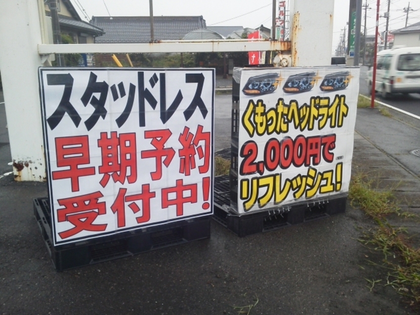 スタッドレス早期予約受付中 & ヘッドライトコーティング の手作り看板を設置しています!!