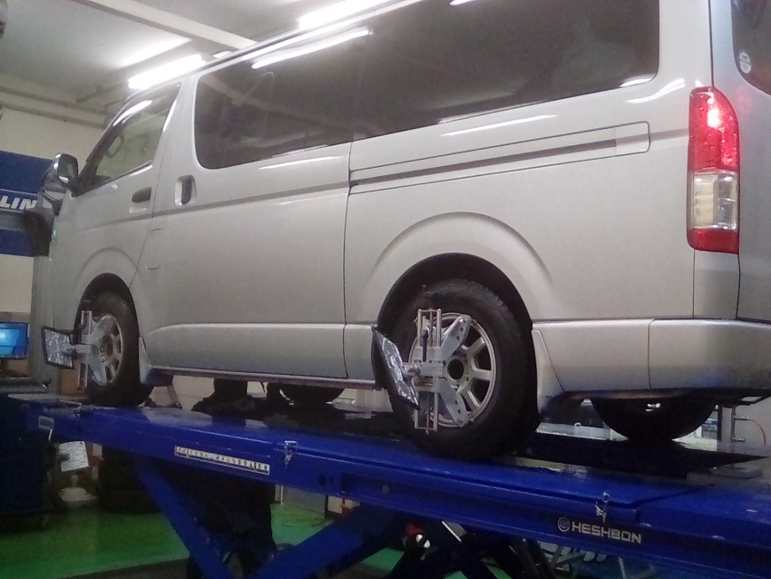本日は、トヨタハイエースのアライメント調整を行いました。
