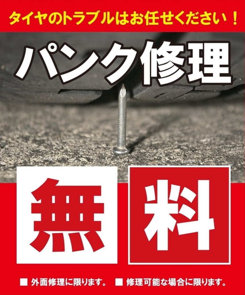 すぐに走行を中止しスペアタイヤへ履き替えの上ご来店ください。