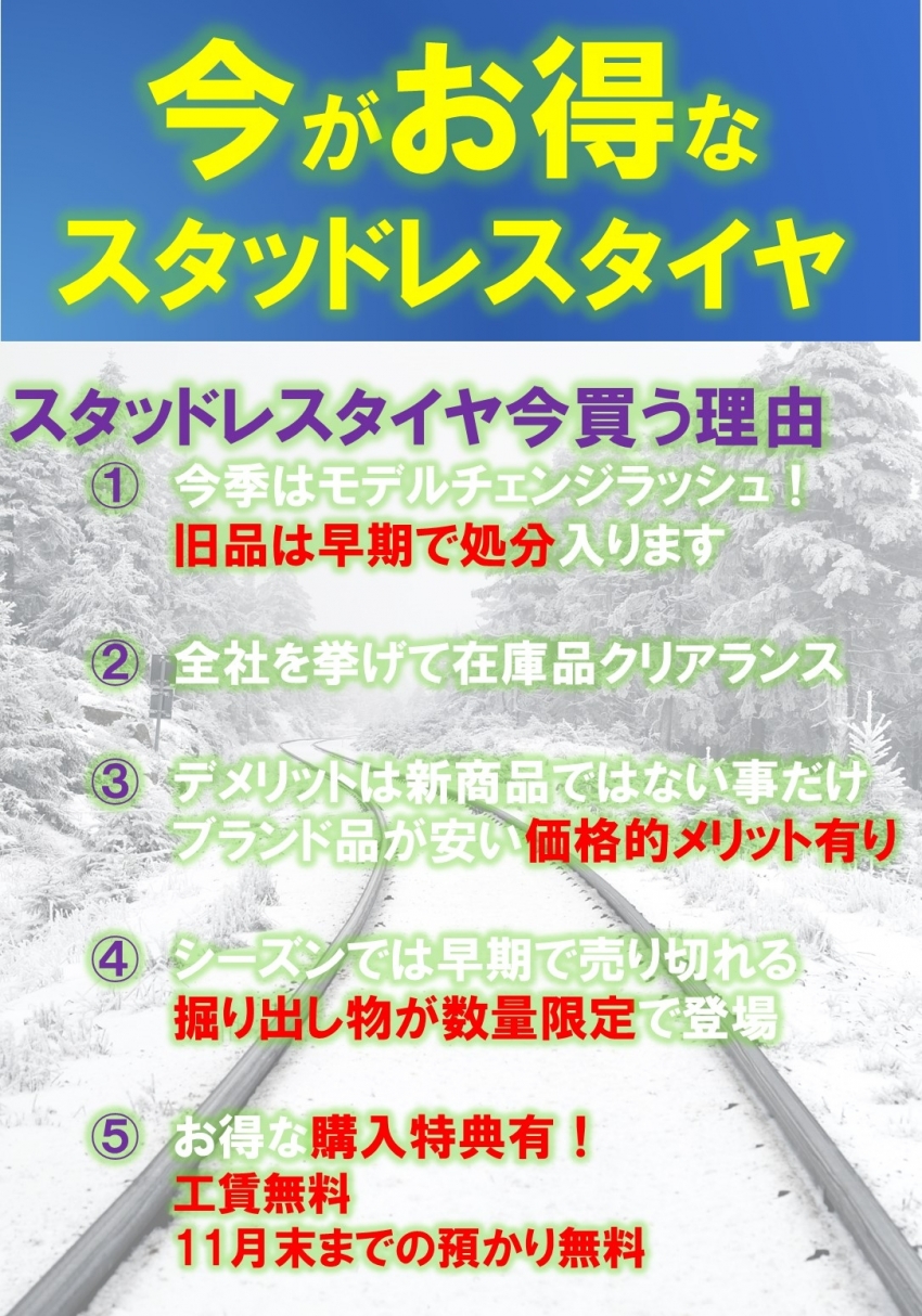 スタッドレスタイヤを買うなら今がお得!!11月末まで預かり無料・・・?