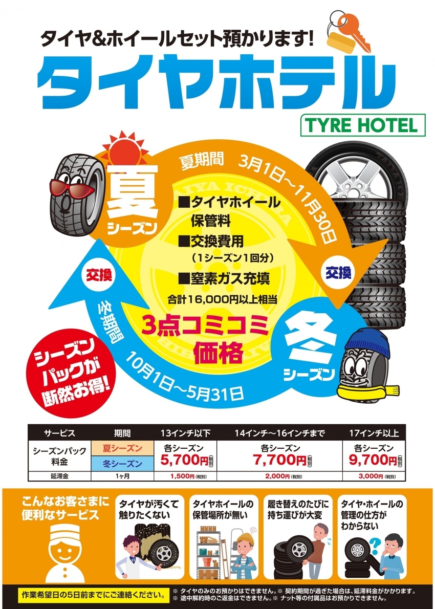 タイヤの保管場所にお困りの方は是非!付替え工賃も含まれたお値段でご案内!タイヤホテル!