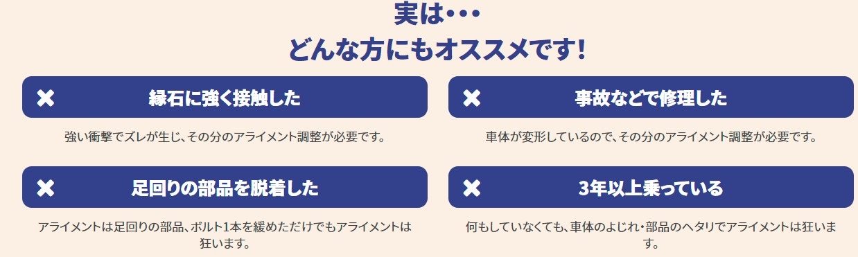 角度が大きくずれている可能性があり、縁石などにぶつけたなどの事故などで損傷個所の可能性がないか確認します。 - 足回りをカスタマイズしてないか