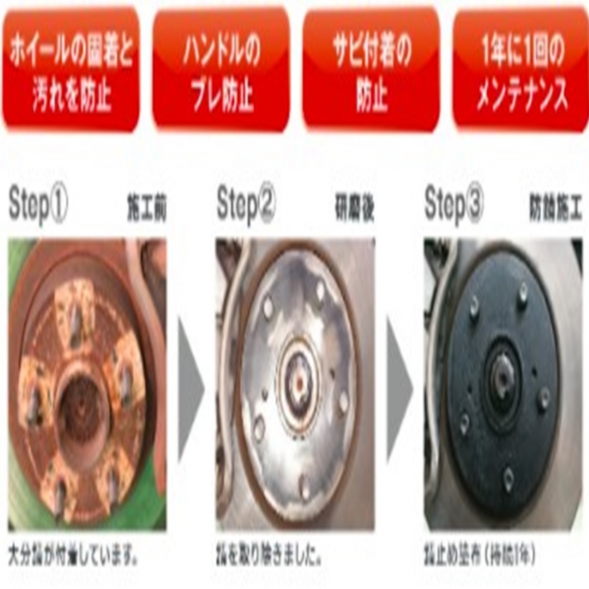 「サビ」が生じるのを防ぐ施工で、ハブ部分の錆びを落としその後、