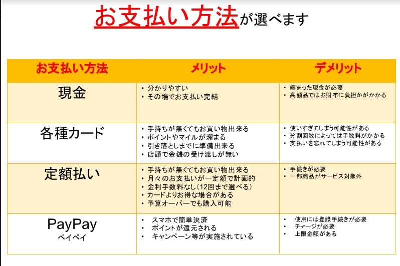 ショッピングローン、各種クレジットカード、PayPay使えます!