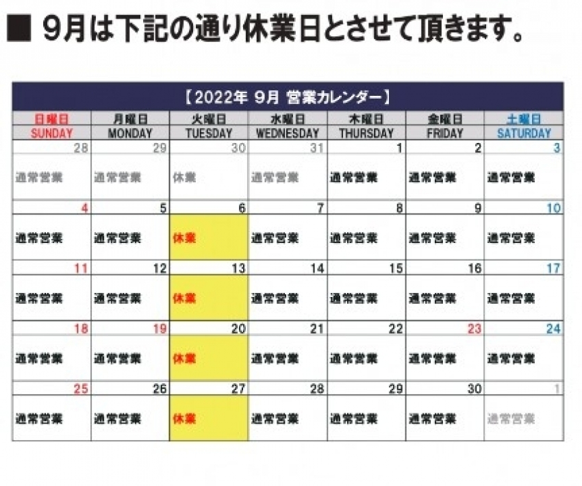 明日9/20火曜日はお休みです