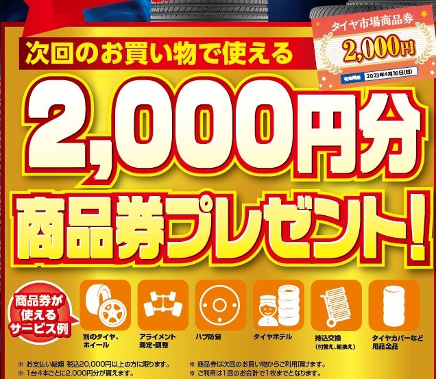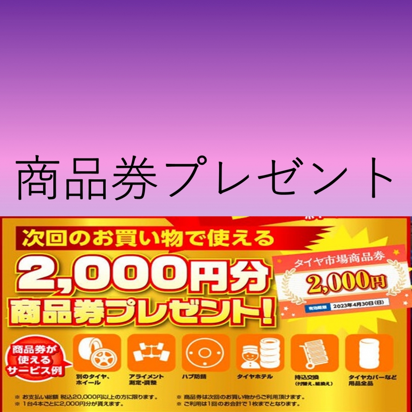 タイヤ4本購入でタイヤ市場で使える2,000円の商品券プレゼント!