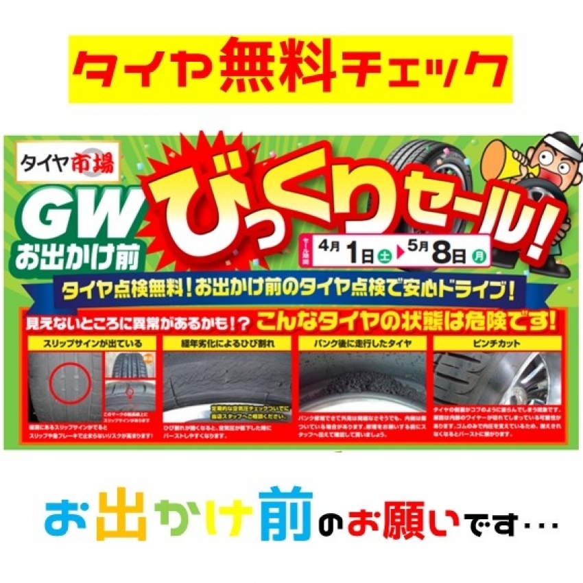 ゴールデンウイーク前のびっくりセール開催中!!お出かけ前のタイヤ点検はお済ですか?