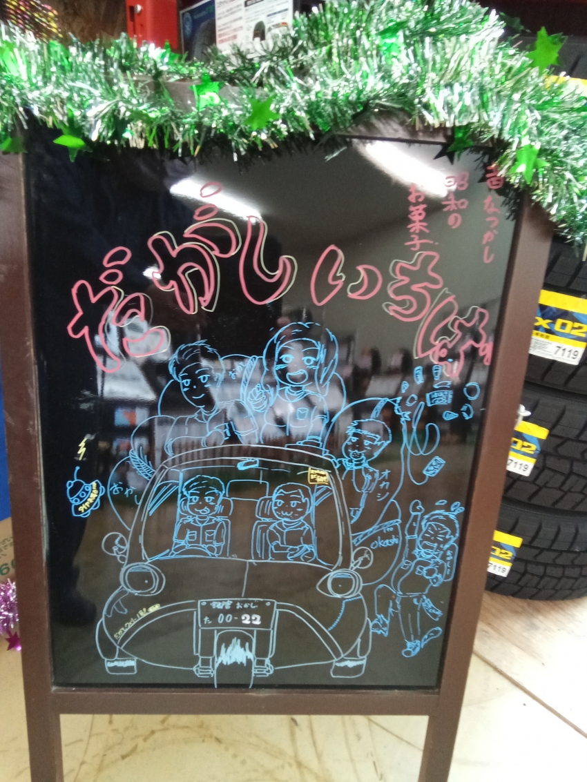 お客様をお迎えする看板に西川田店の来栖画伯が描いた
