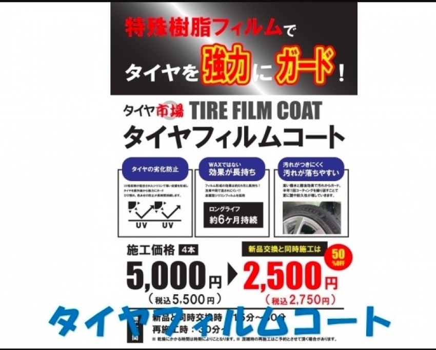 フィルムコートをして頂く事でタイヤの劣化防止にもなりますし、なにより効果は約半年間続き汚れも付きにくく汚れも落としやすいので、とても優れたサービスとなりますので是非お試しして頂きたいと思いますのでお気軽にご相談くださいませ!