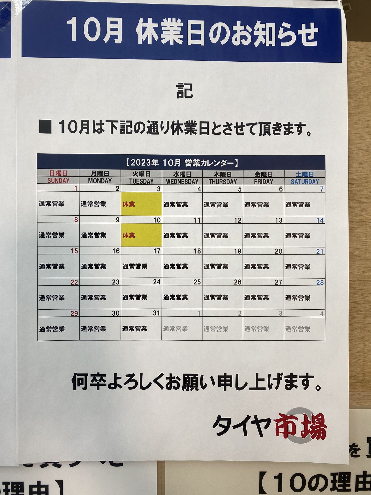 10月のタイヤ市場西川田店 店休日のお知らせ