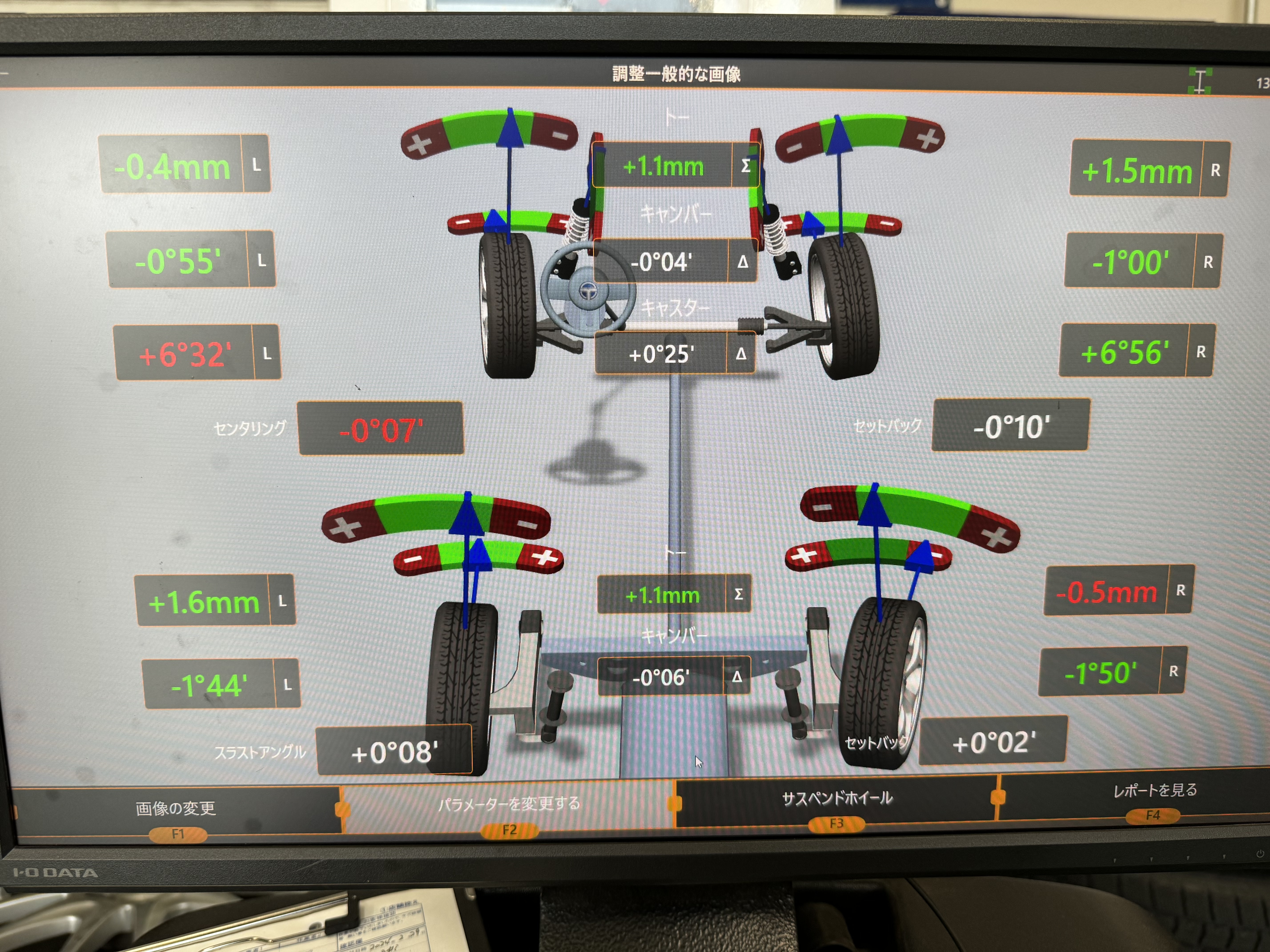 調整後の写真を取り忘れてしまいましたが、前後トーが調整可能なためフロントは片側+0.5㎜、リアは片側+1.5mmの基準値で今回は調整を行いました!