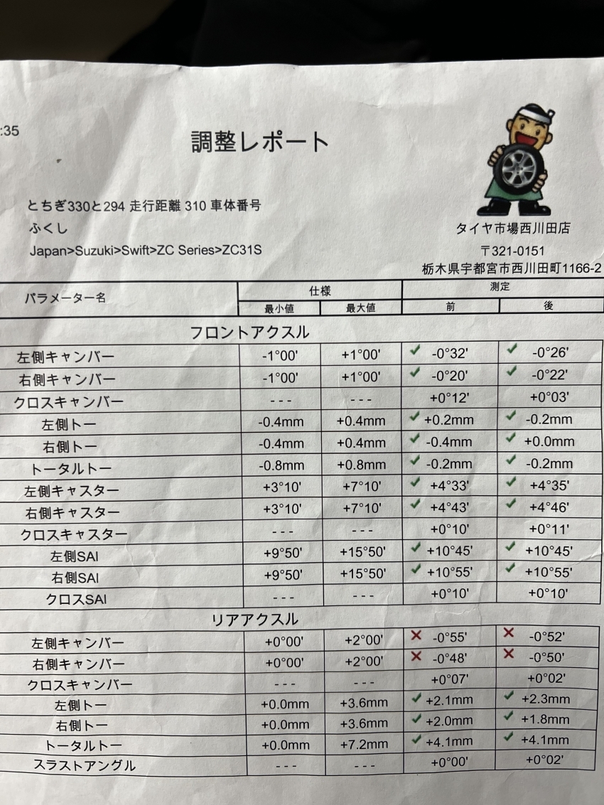 最初の写真は走行距離310キロのスイフトでアライメント測定した結果です