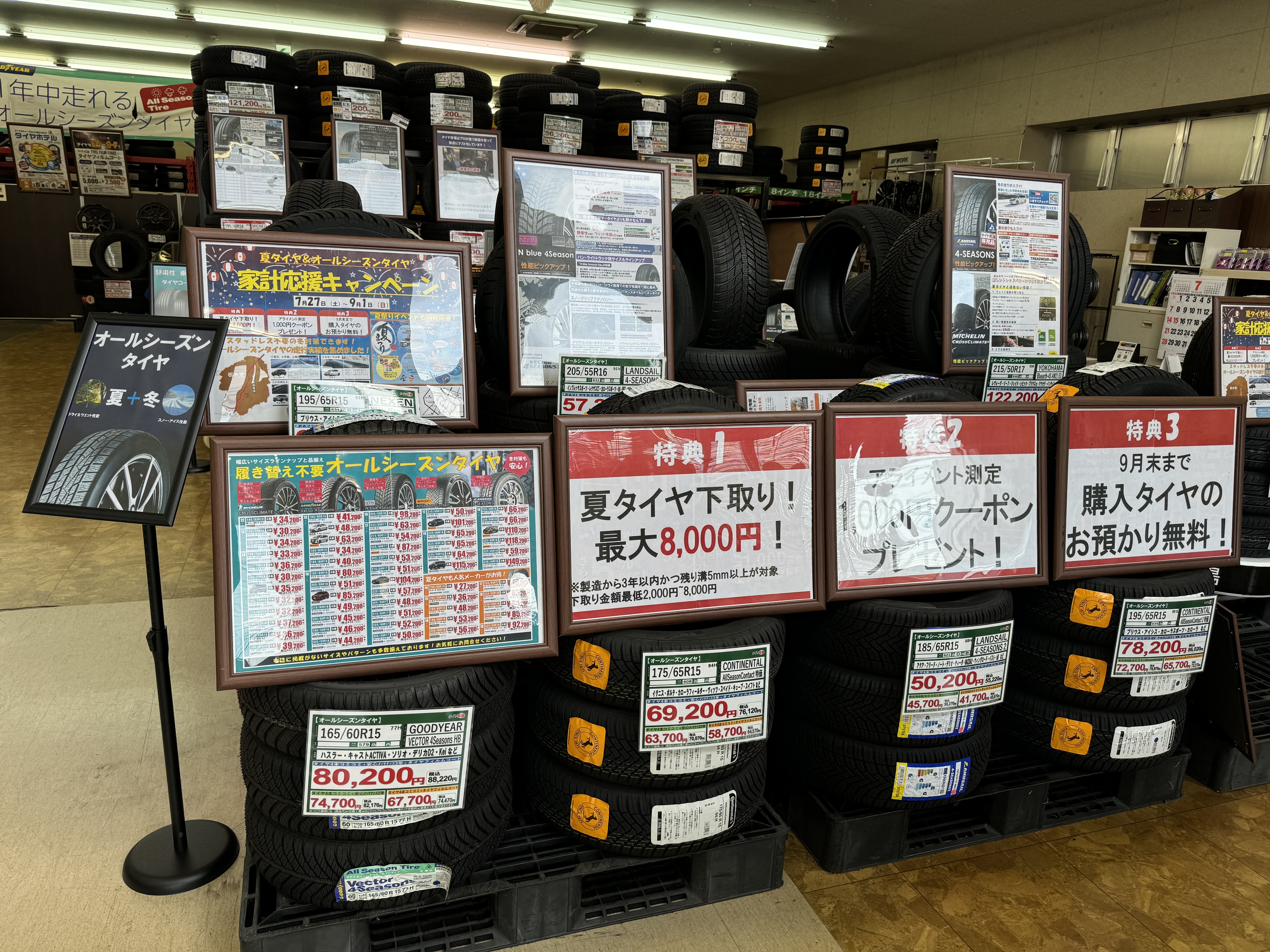 もちろんタイヤ家計応援キャンペーンで特にオールシーズンタイヤがお買い得、特典付きで大放出!!