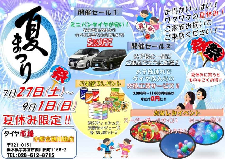 お盆が終わってもタイヤ市場宇都宮西川田店の夏祭りはまだまだ続くぜ!!ぜひご家族で遊びに来てね!!