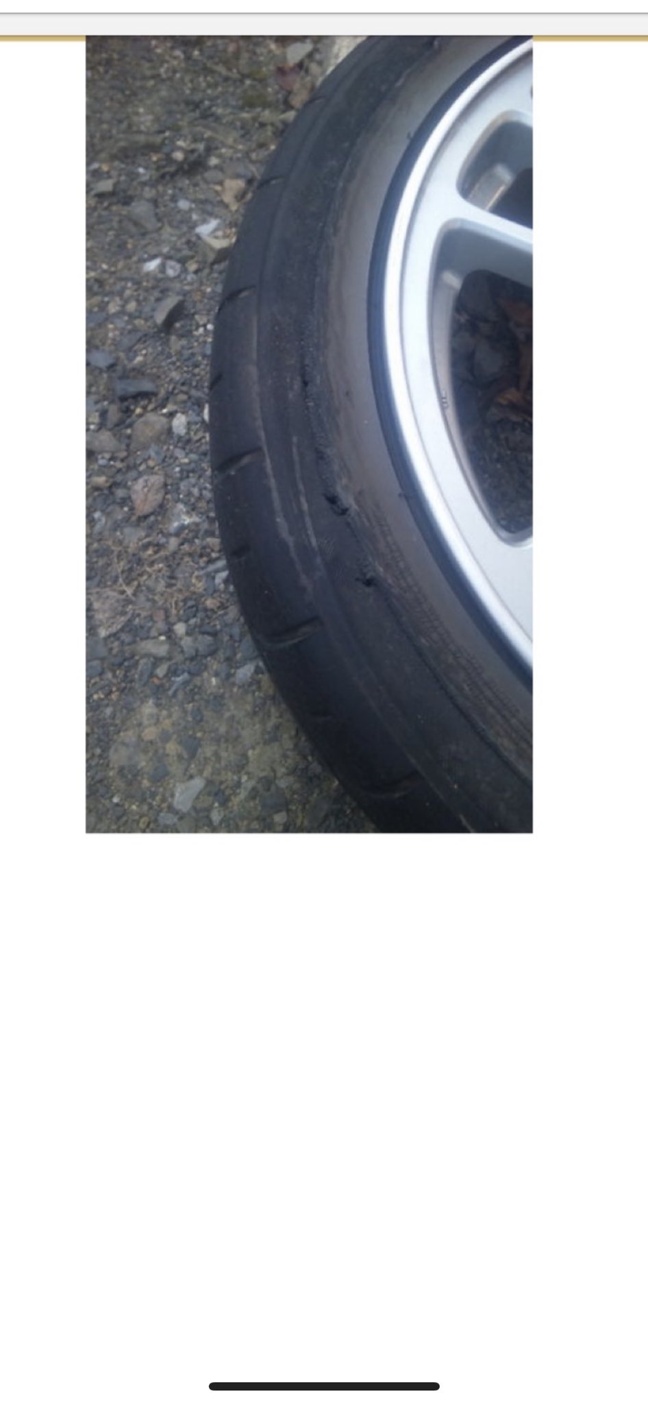 落下した氷の塊を避け切れずに右前のタイヤで踏みバーストしたタイヤの写真です