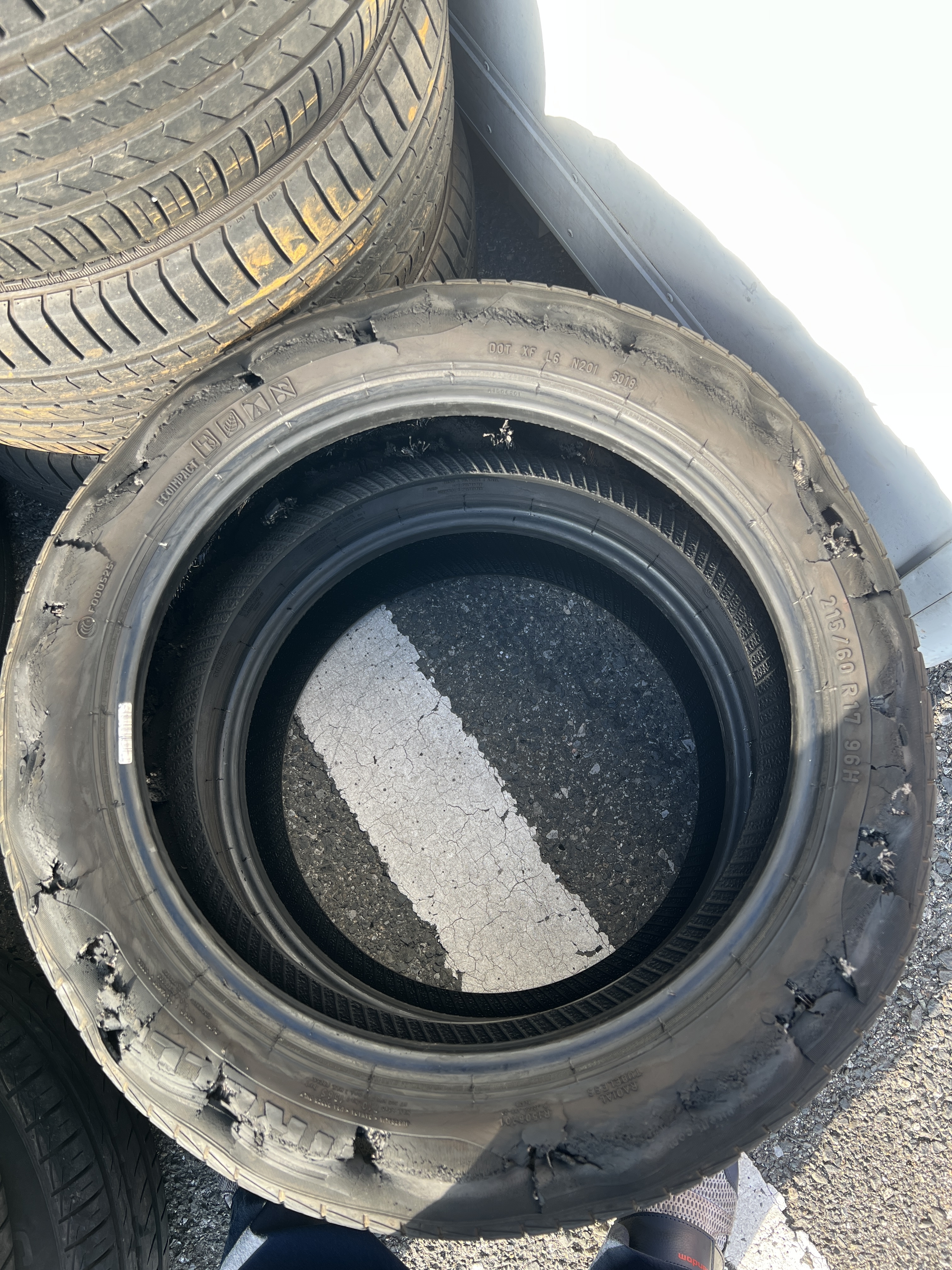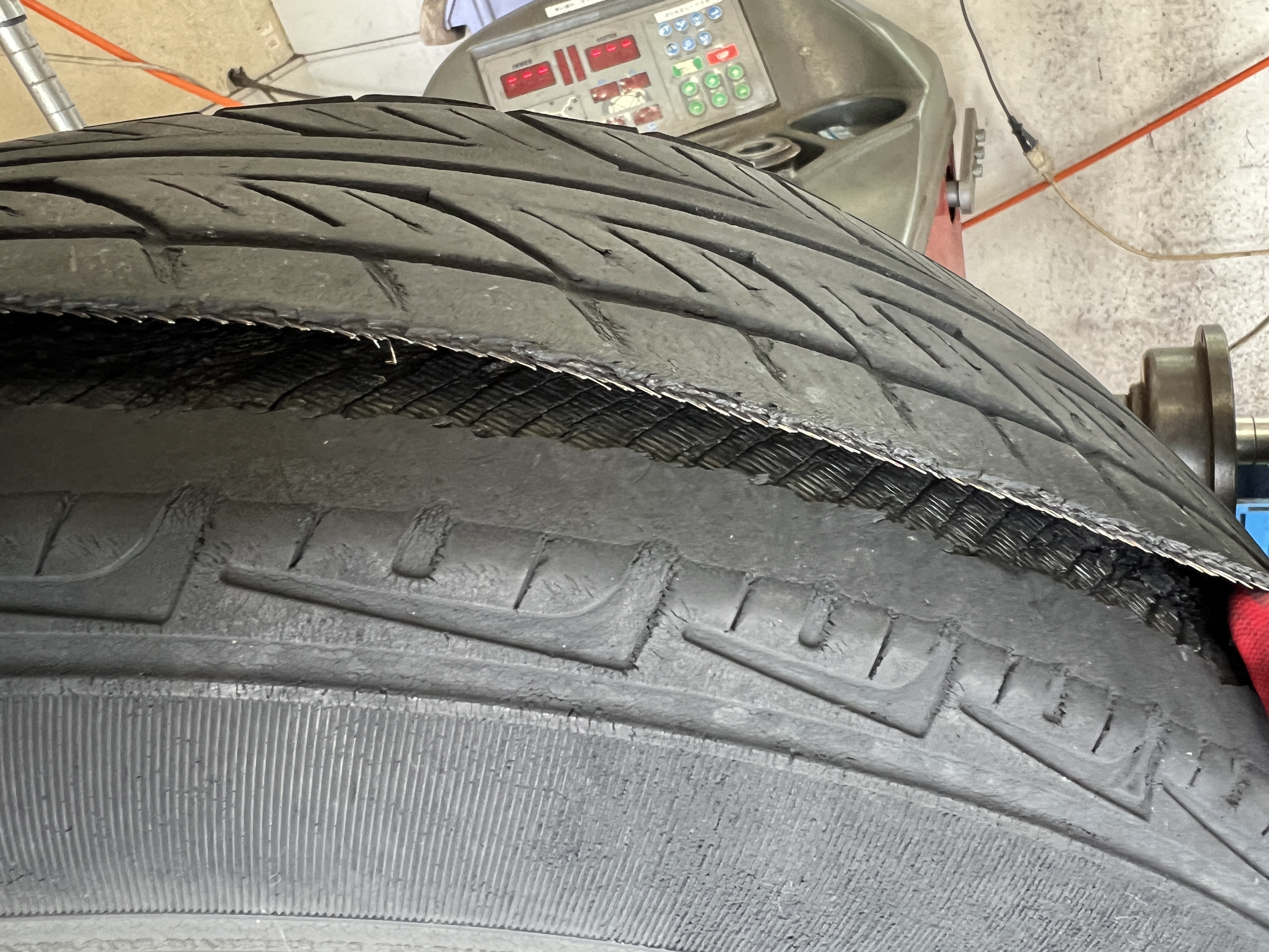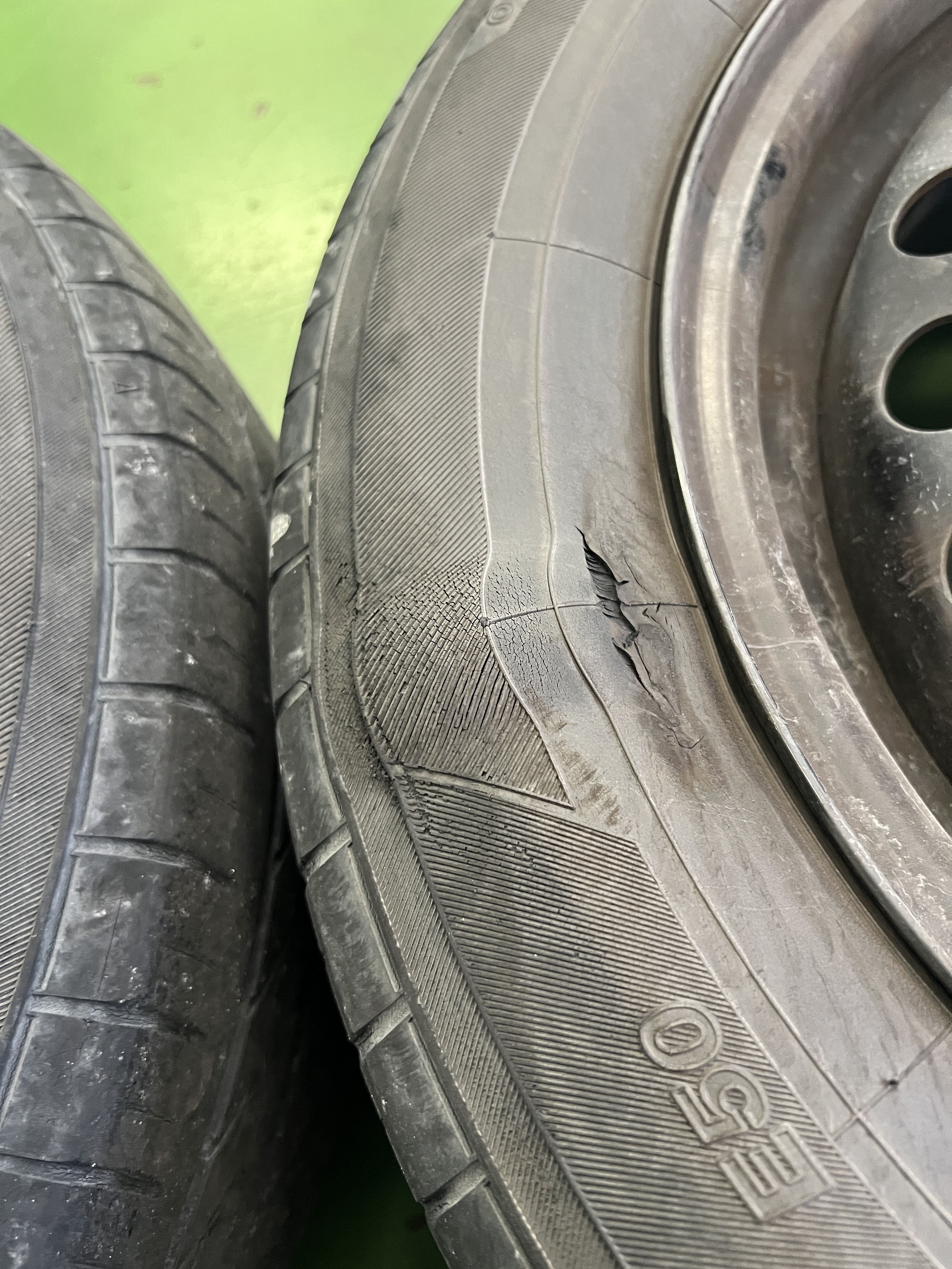 コレはタイヤの横を強くぶつけてしまい、タイヤの中のワイヤーが切れている状態です