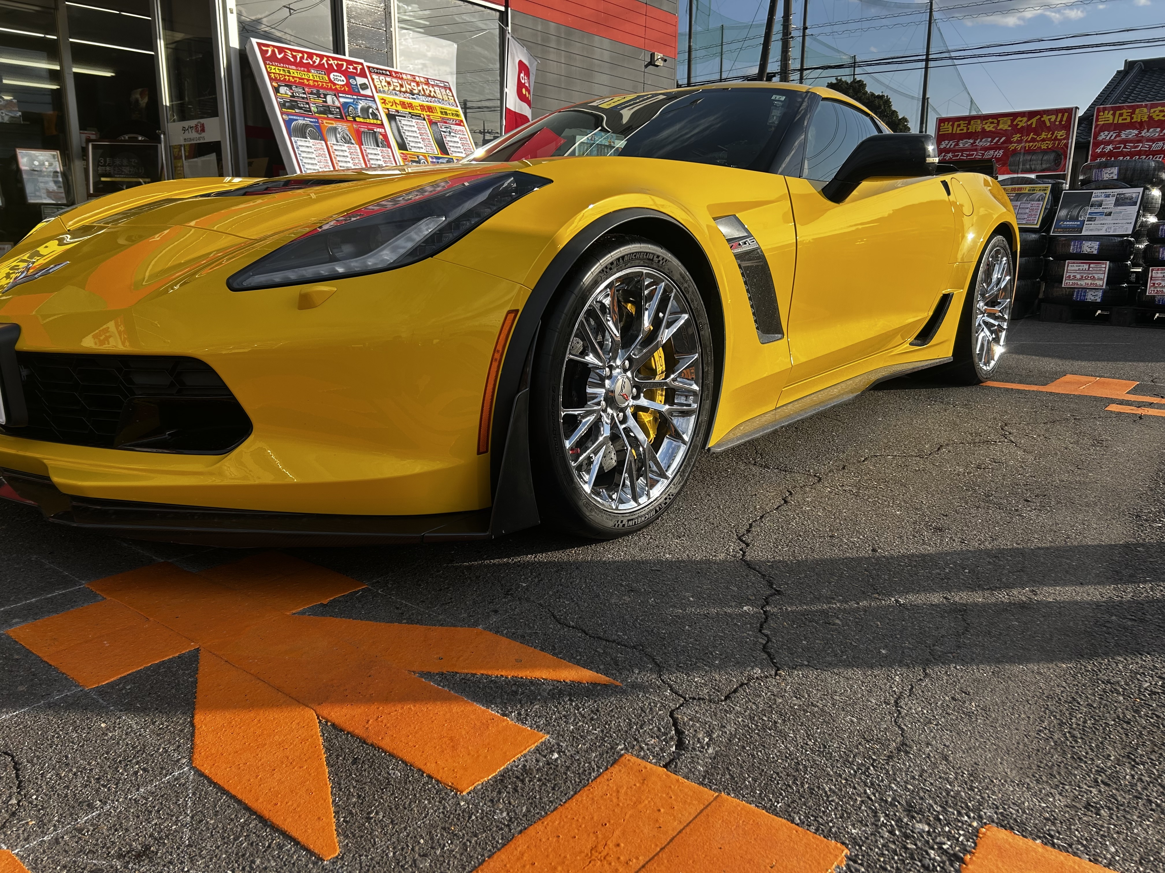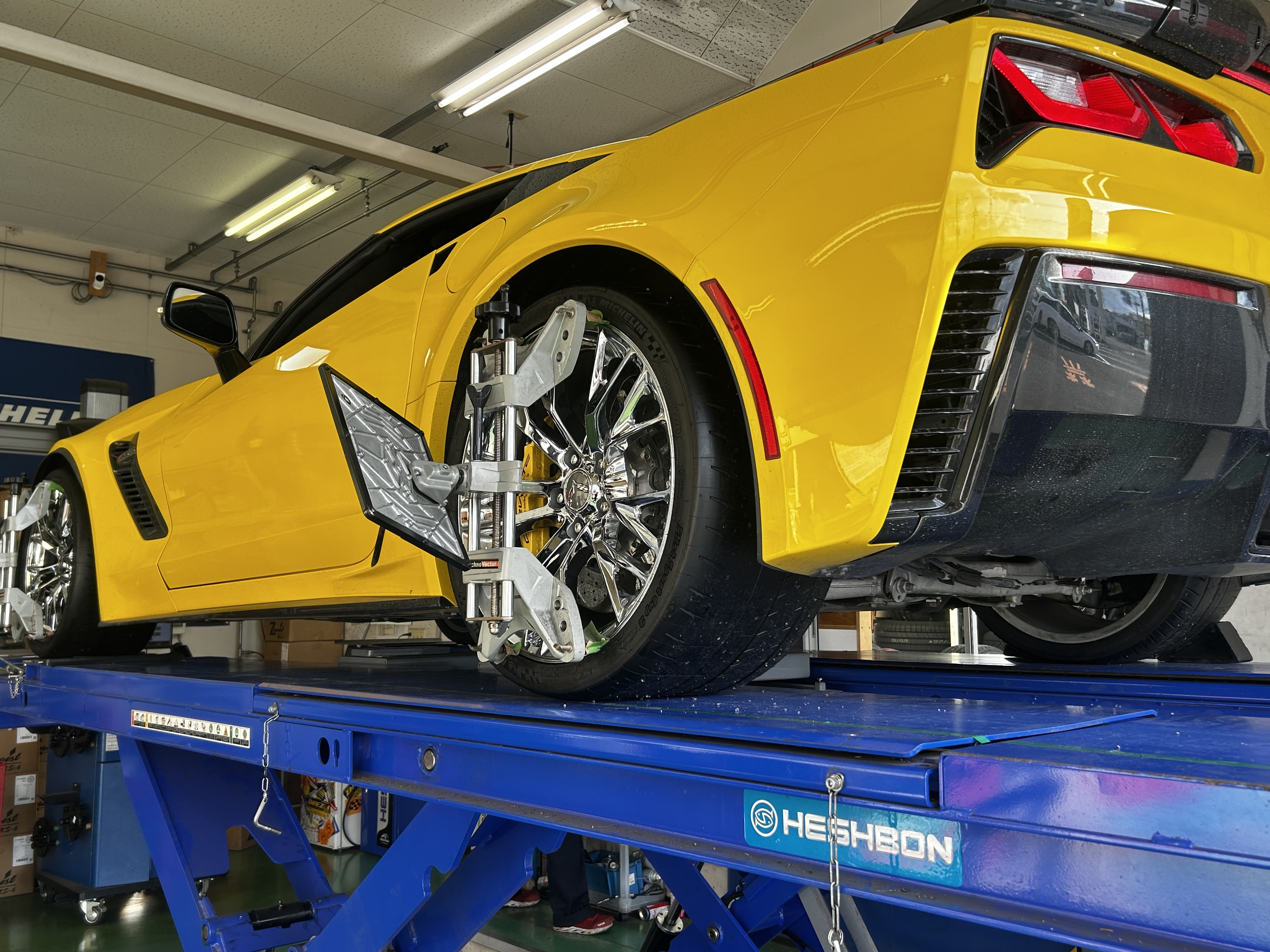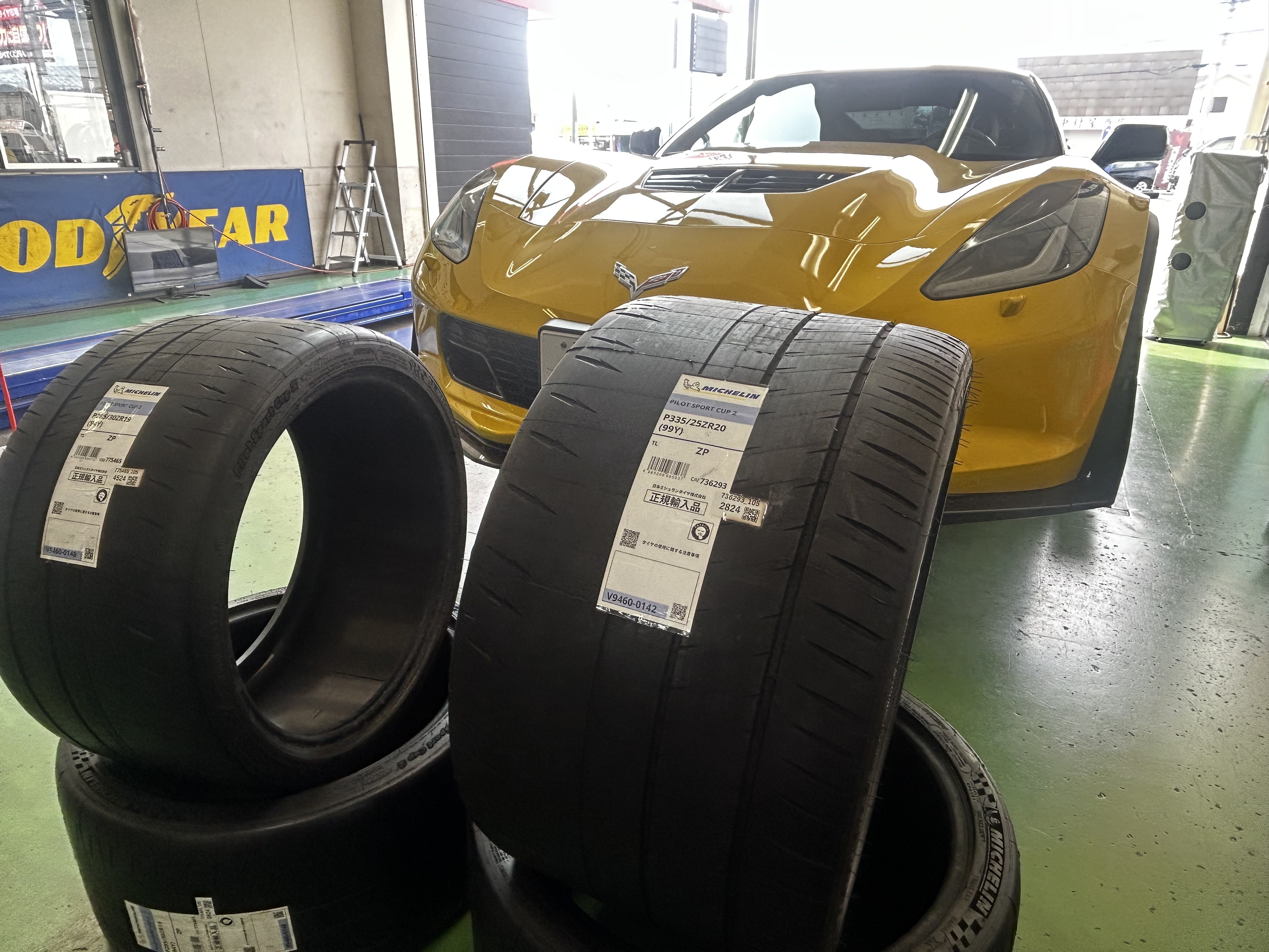 シボレー コルベットにランフラットタイヤお取り付け致しました!ミシュランのパイロットスポーツカップ2前後異形サイズで285/30R19&335/25R20 ご一緒にアライメント調整も行いました(*^▽^*)当店ではランフラットタイヤのお取り付け可能!輸入車のタイヤのお取り付け可能!輸入車のアライメント調整可能!