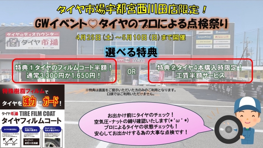 タイヤ市場宇都宮西川田店限定イベント!GW♡タイヤのプロによる点検祭り開催!4/25(土)~5/10(日)まで限定!
